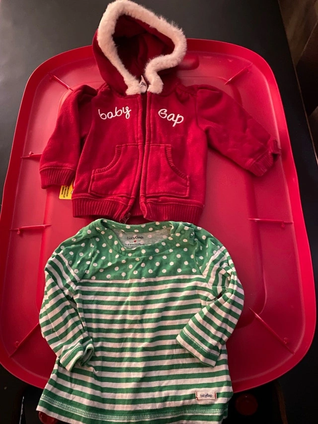 Adorable Baby Gap clothing set, perfect for your little one aged 3-6 months! This set includes a cozy red zip-up hoodie with a faux fur trim and a cute green and white striped long-sleeve shirt. Both items are in good condition and ready for a new home. Brand: Baby Gap. Size: 3-6 Months. Includes: Hoodie and Long-Sleeve Shirt. If this ad is still up, it's available! Asking $18. Cash or cashless payment accepted. Curbside pickup available.