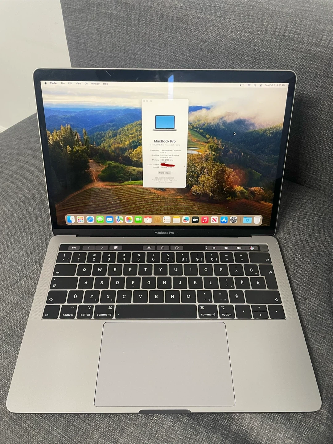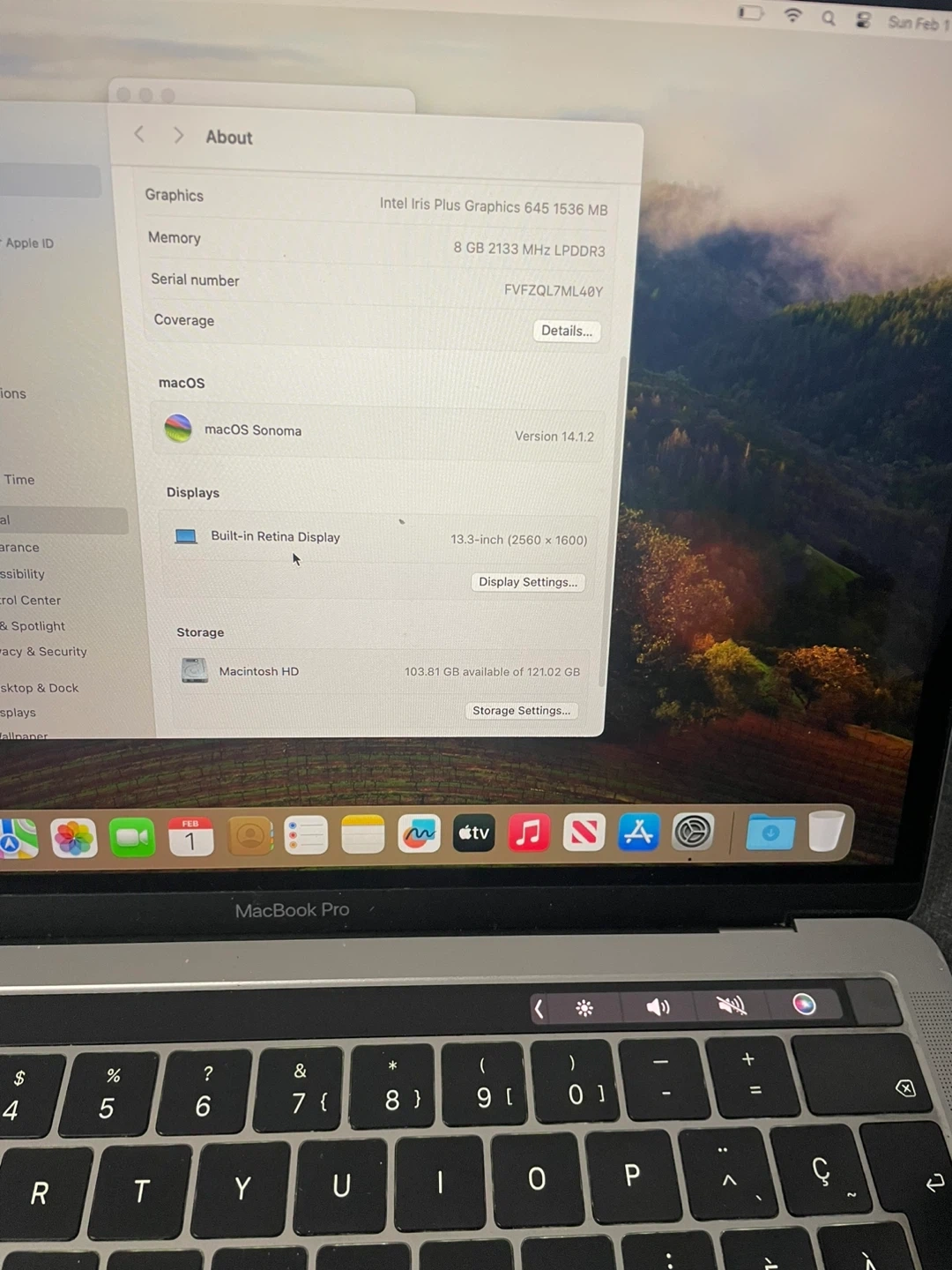 This MacBook Pro is a 13-inch model from 2019, featuring two Thunderbolt 3 ports. It's equipped with an Intel Core i5 processor, Intel Iris Plus Graphics, and 8 GB of 2133 MHz LPDDR3 memory. The storage capacity is128GB SSD. It runs macOS Sonoma, version 14.1.2. This laptop is great for everyday tasks and productivity!