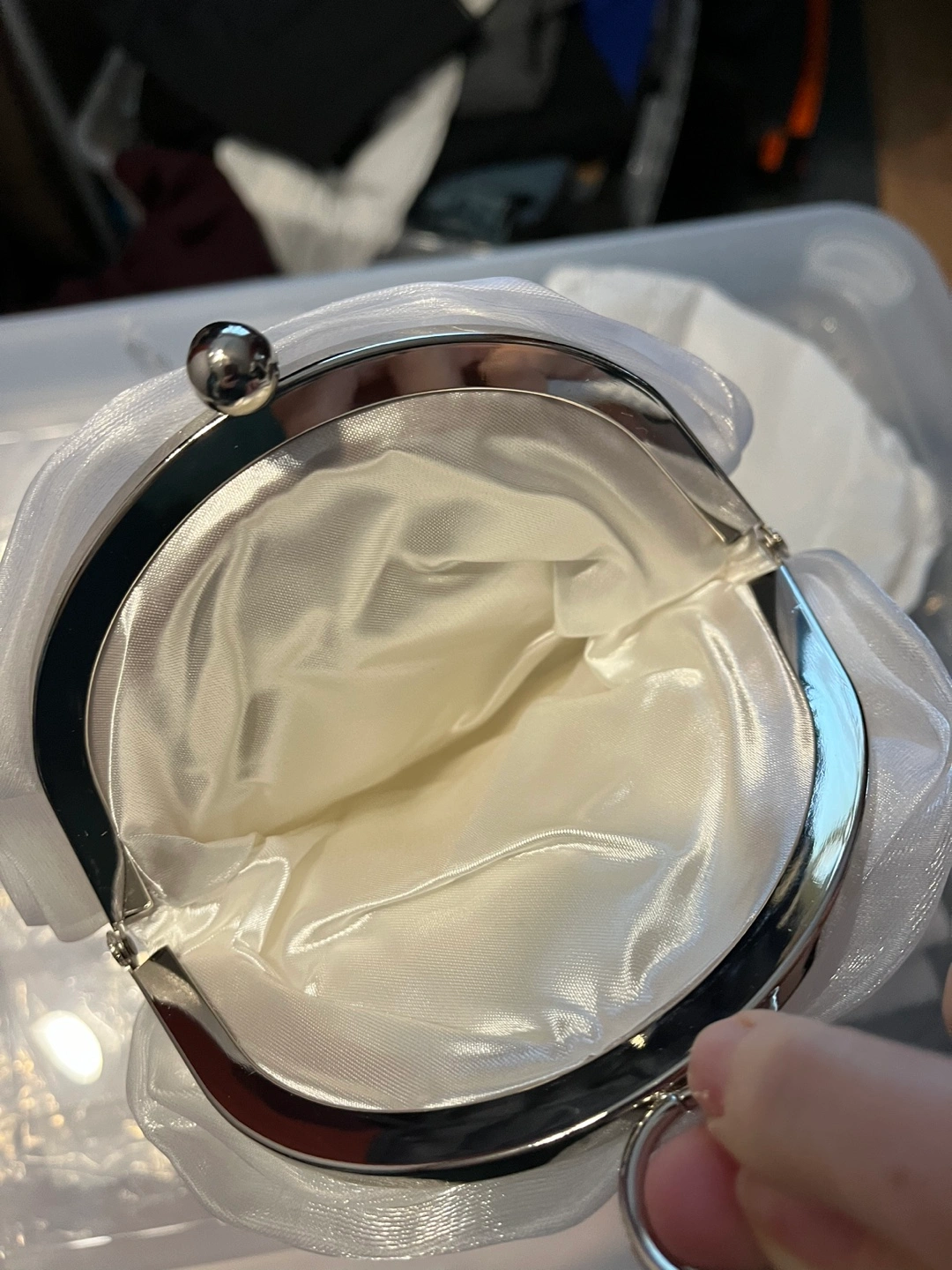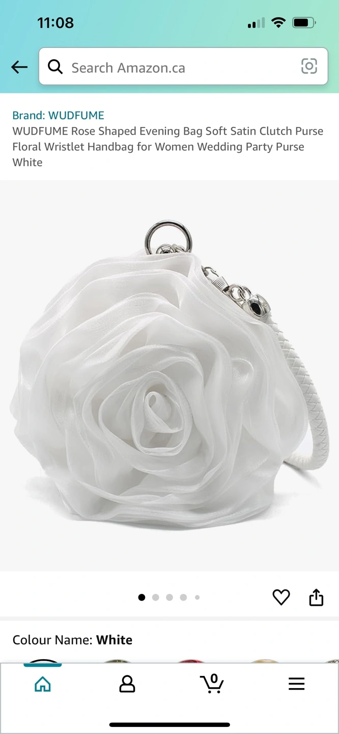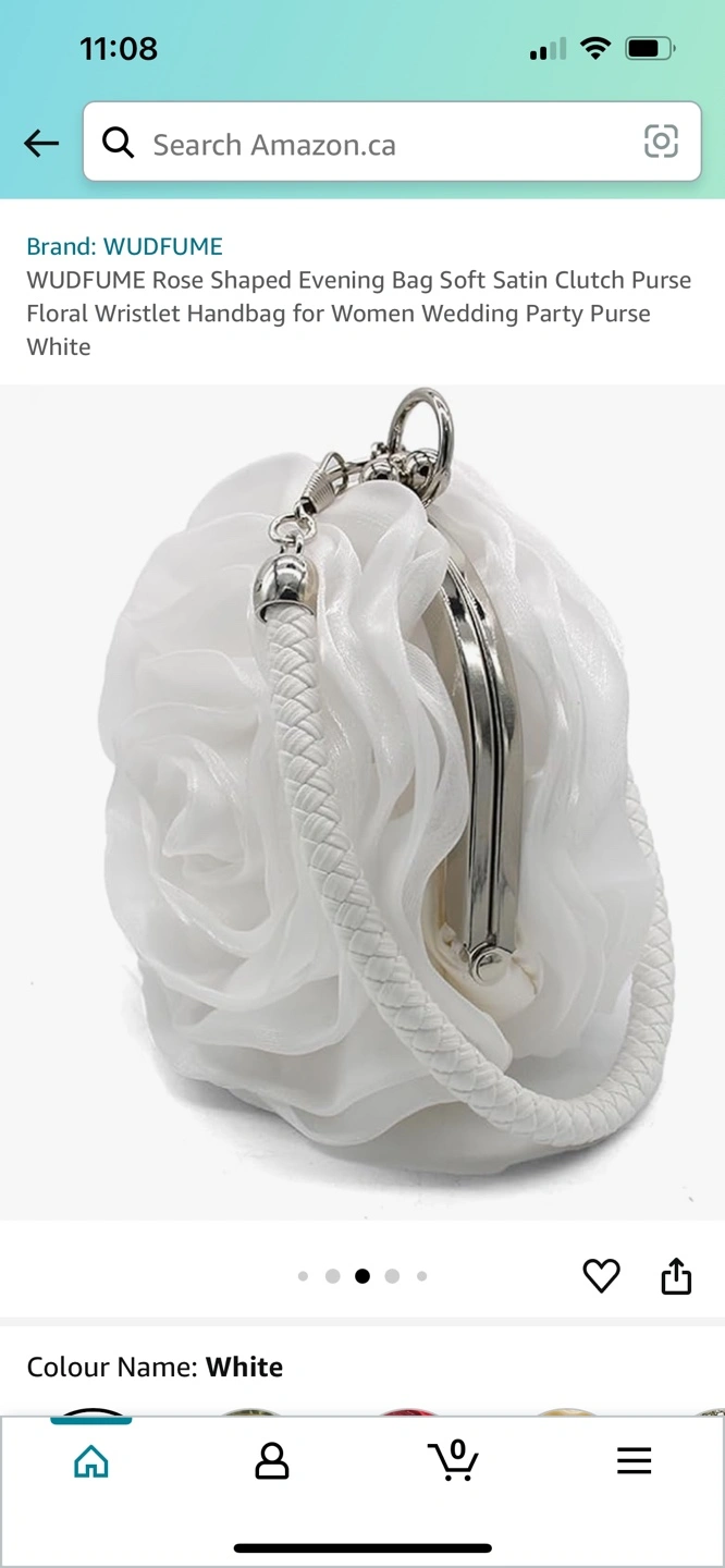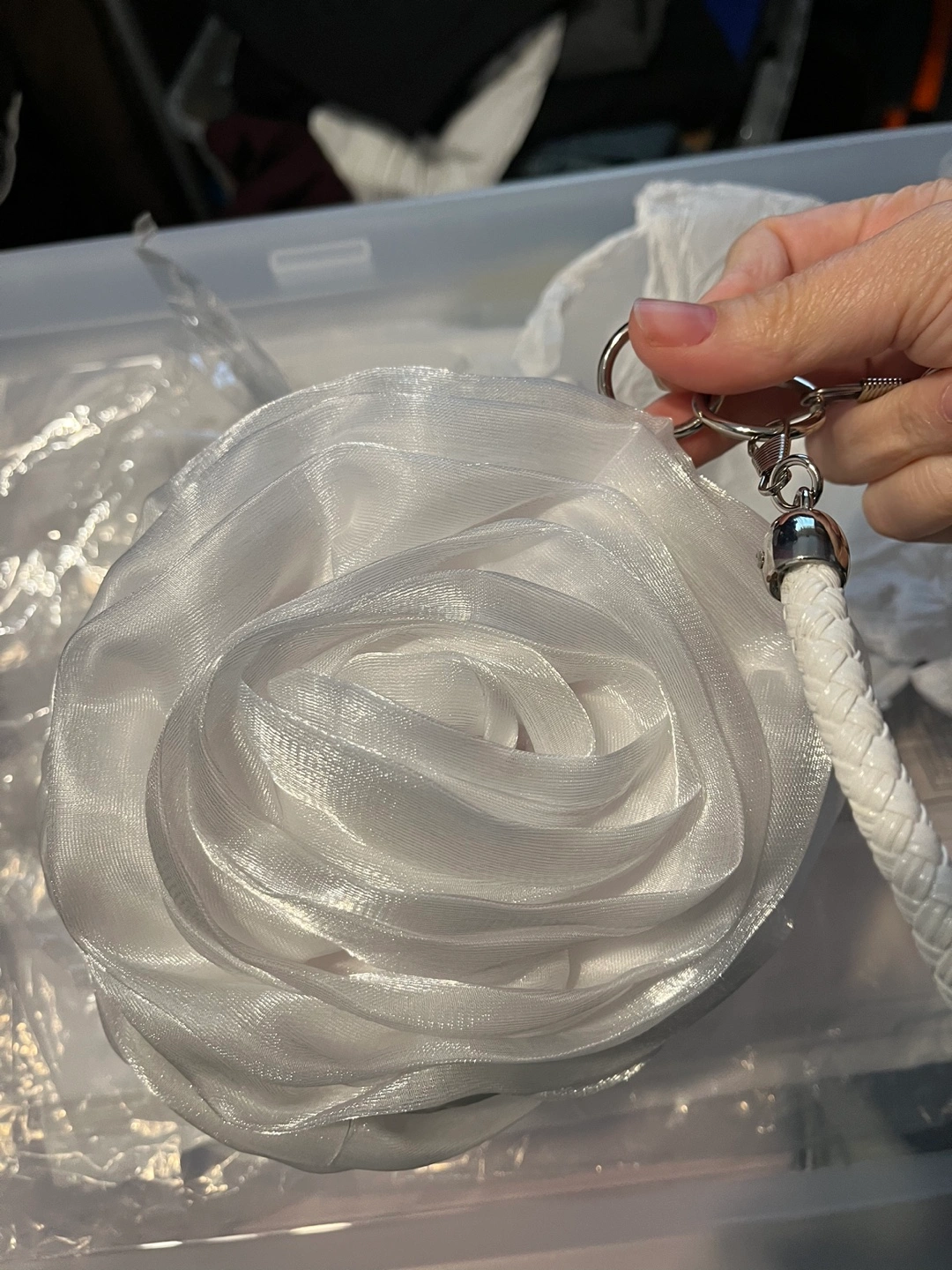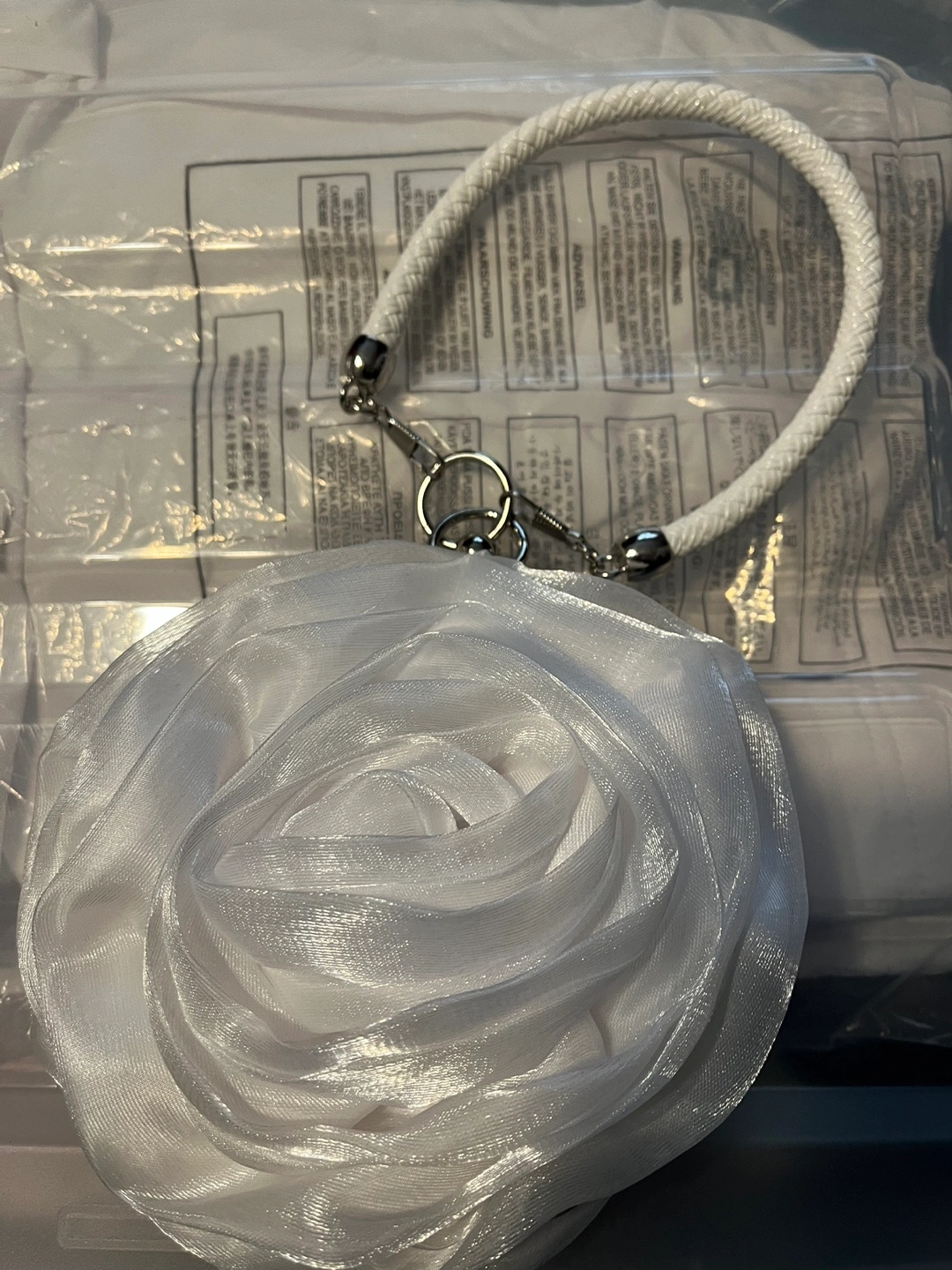 White satin clutch purse shaped like a rose. Has a wristlet strap. Perfect for weddings or special occasions. New in package.
