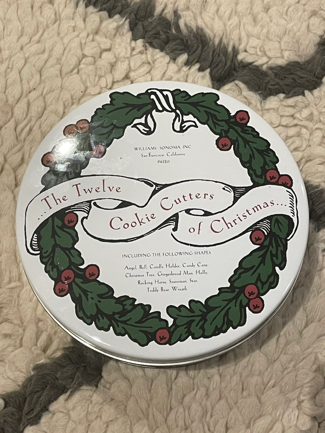 Vintage Williams Sonoma cookie cutters. Twelve festive shapes in a collectible tin. Great for holiday baking.