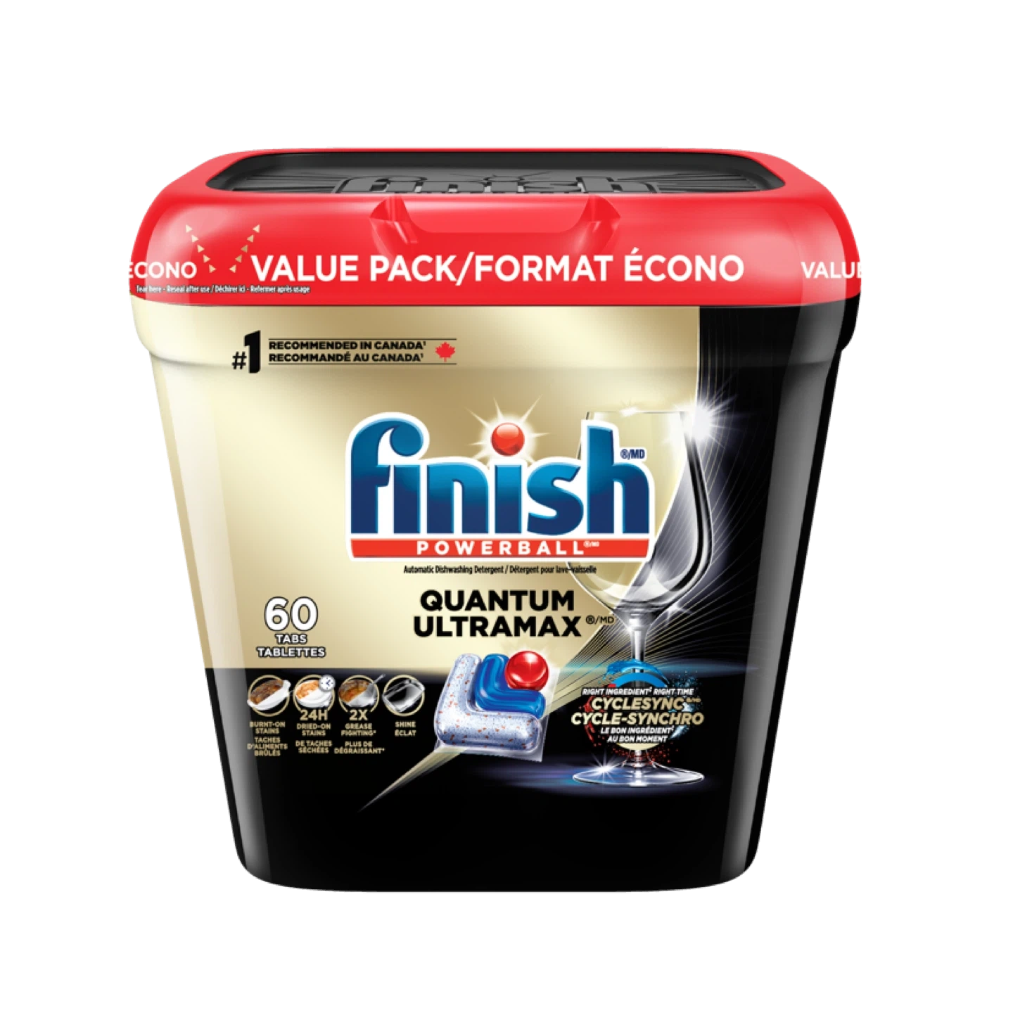 Ce contenant de 60 tablettes Finish Quantum Ultramax est un format écono. Il est recommandé au Canada. Les tablettes combattent les taches incrustées et séchées.