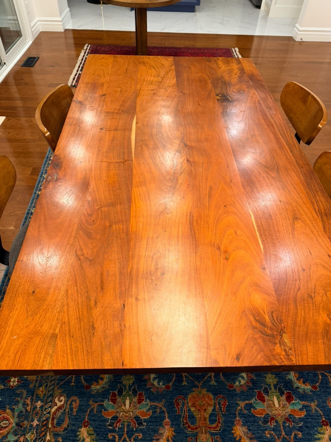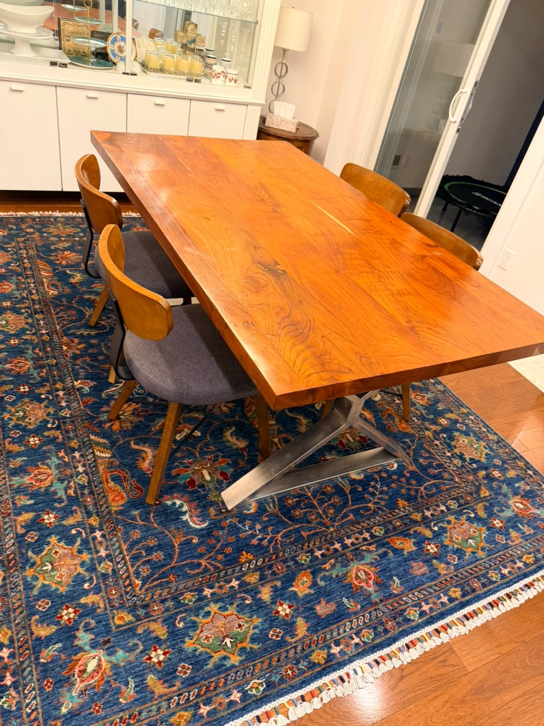 Spacious dining table with a beautiful live edge wood top and a sturdy metal pedestal base. It comfortably seats six people. Perfect for family dinners and entertaining guests! Minor scratches. Very sturdy and heavy wood. Great table for daily use. Chairs and carpet NOT included) Selling below market value.