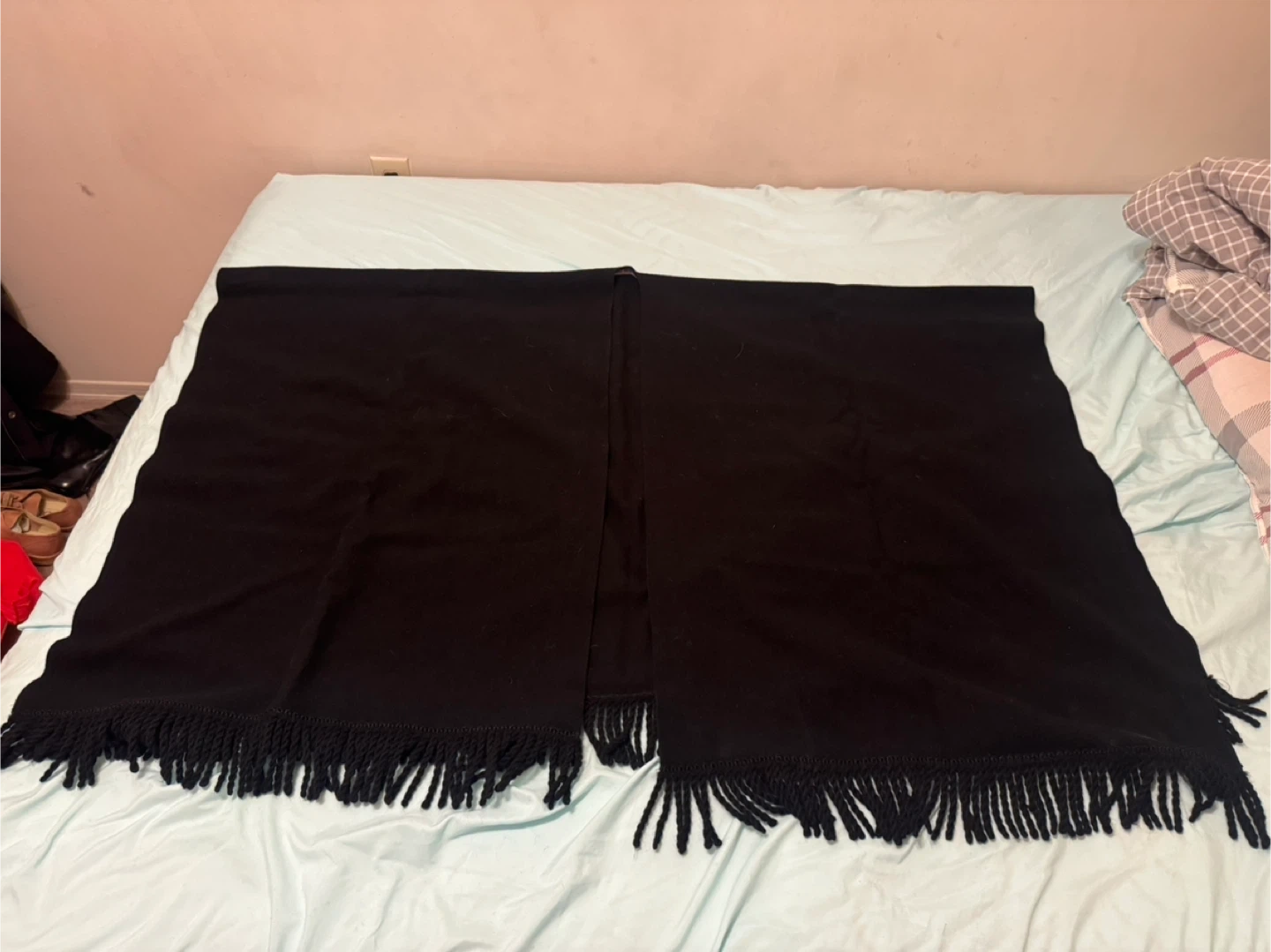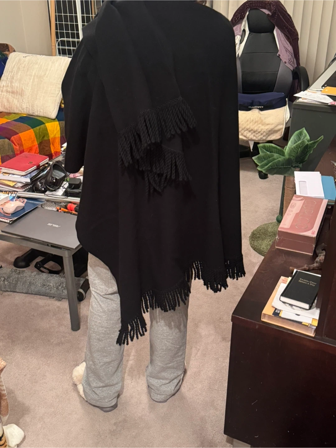 Selling a stylish Holt Renfrew black poncho with fringe detailing!