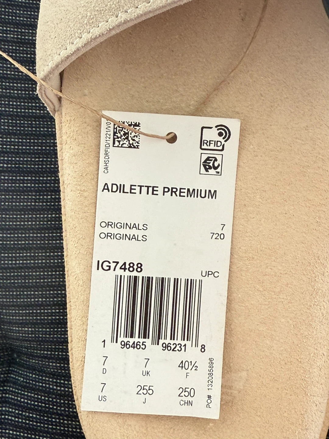 Selling a pair of Adidas Adilette Premium slides in a lovely neutral colour! They are a size 7 US. The upper is made of leather and textile material. These are brand new with tags still attached!