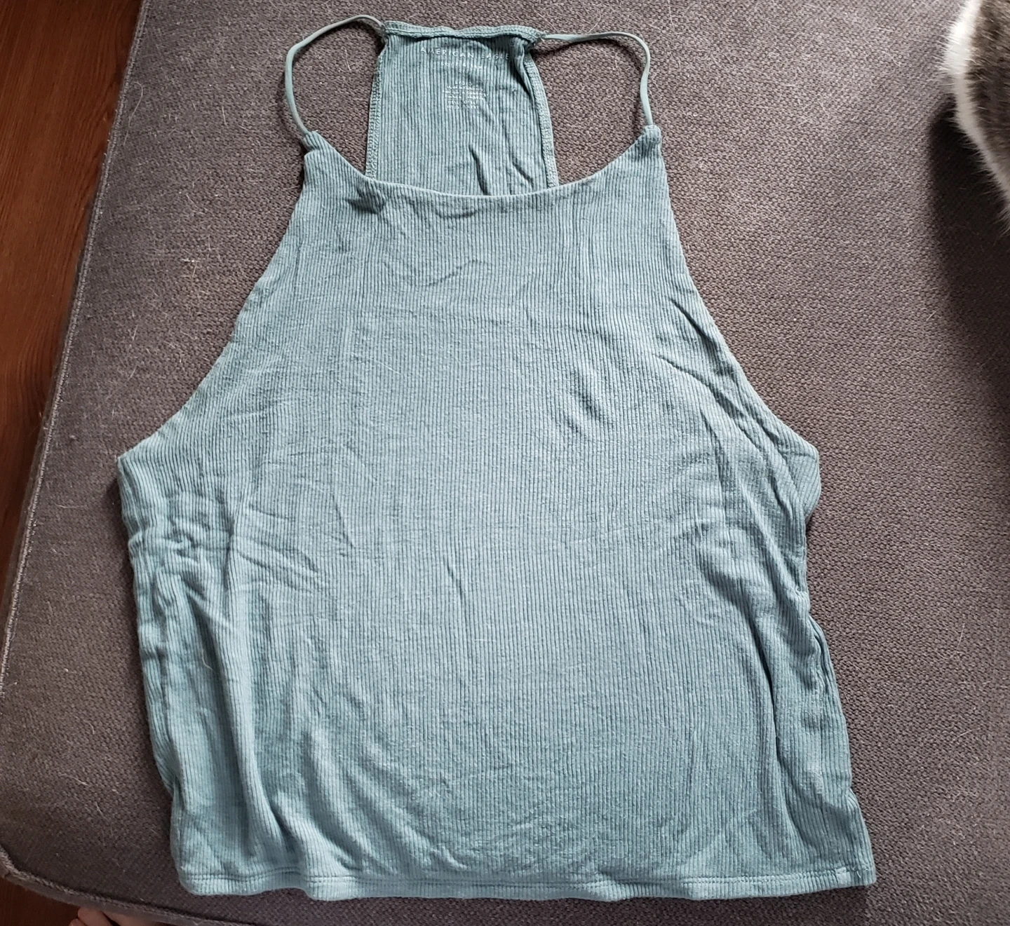 Sage green ribbed tank top. Racerback style. Soft and stretchy material. Lightly worn. Size Large, fitted. Made in Cambodia.