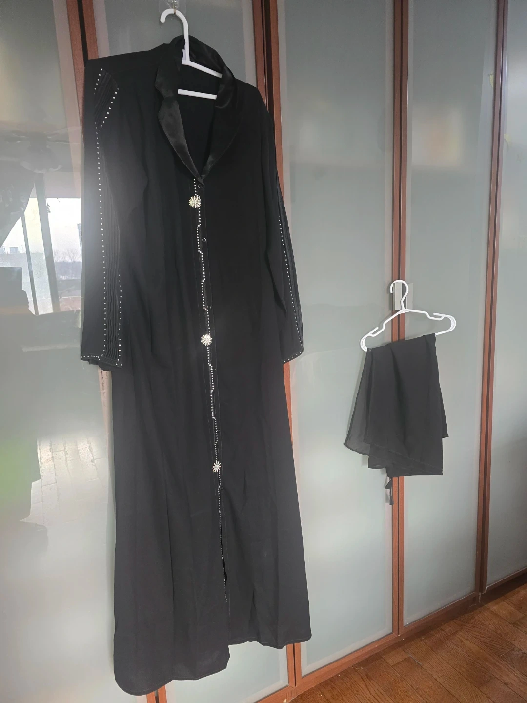 This black abaya set includes a long open-front abaya and scarf matching . It's adorned with pearl-like beading and decorative. The collar and lapel are finished with satin trim. This elegant set is suitable for formal occasions.