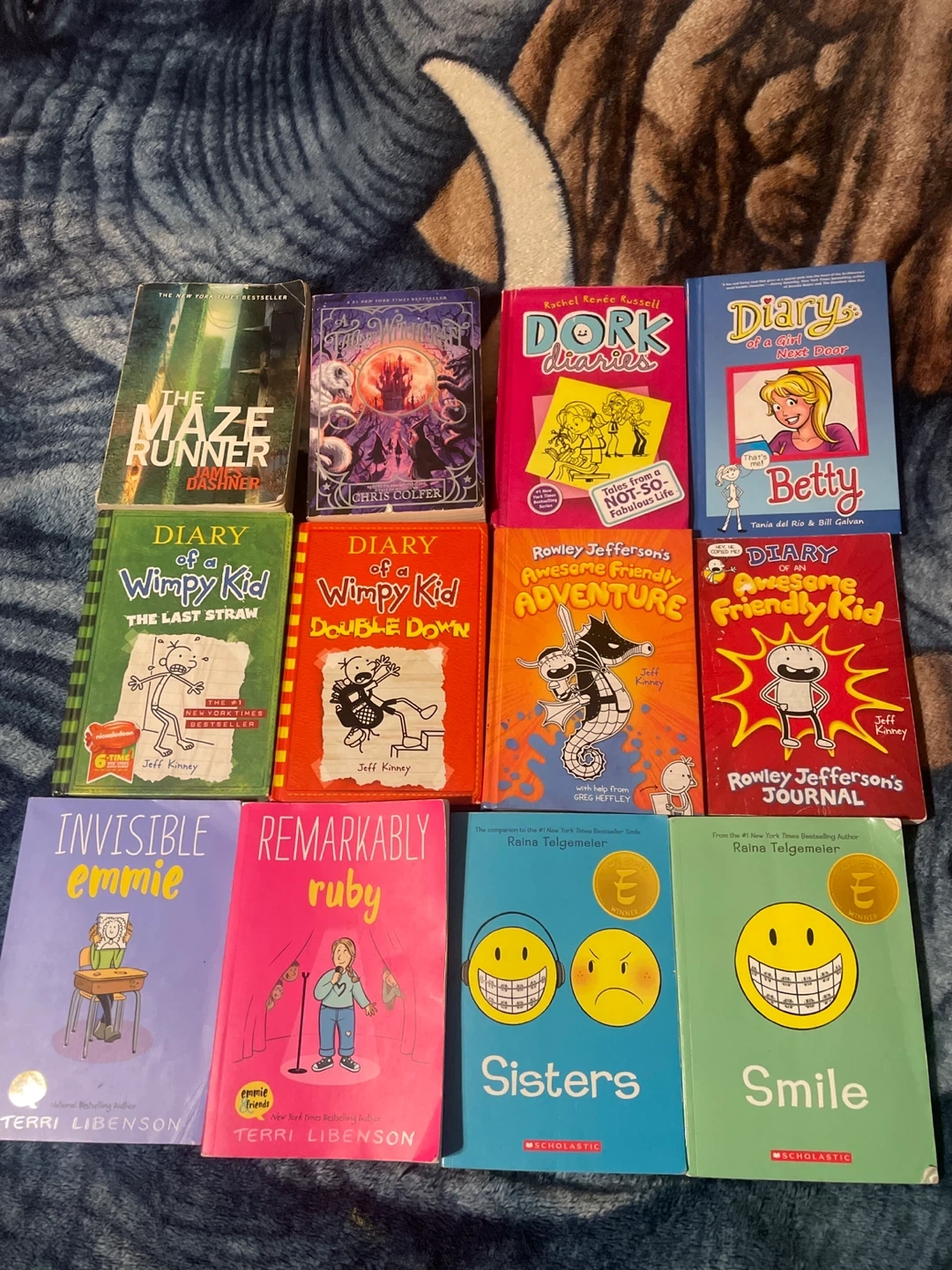 Collection of popular children's books including Diary of a Wimpy Kid, Dork Diaries, and Raina Telgemeier titles. These are paperback editions. Titles include The Maze Runner, The Land of Stories, Dork Diaries, Diary of a Girl Next Door: Betty, Diary of a Wimpy Kid: The Last Straw, Diary of a Wimpy Kid: Double Down, Rowley Jefferson's Awesome Friendly Adventure, Diary of an Awesome Friendly Kid: Rowley Jefferson's Journal, Invisible Emmie, Remarkably Ruby, Sisters, and Smile. Great for young readers! ($EACH)