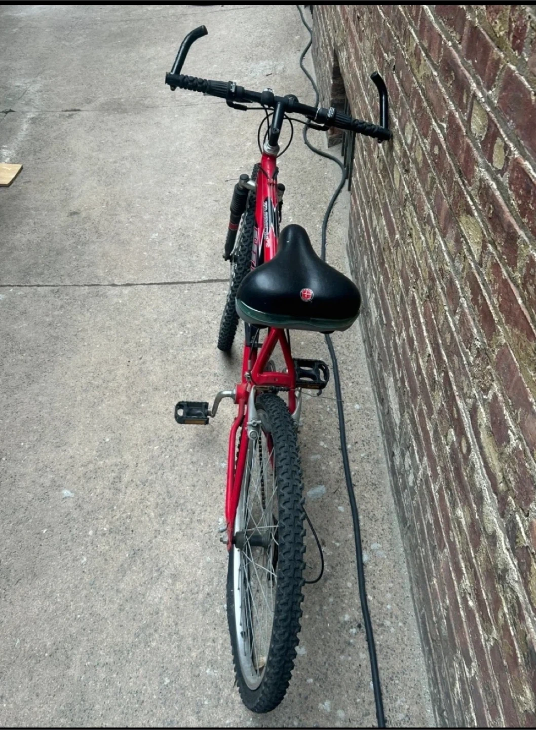 This is a red Huffy mountain bike. It's equipped with 26-inch wheels and a front suspension fork. Ready for your next adventure!