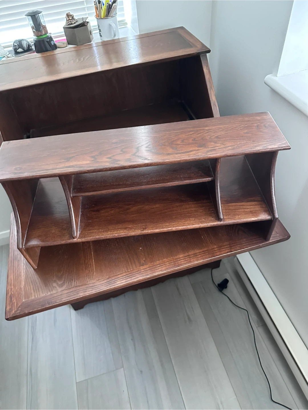 Lovely antique drop front desk in solid wood! It features a drop-down writing surface and several drawers for storage. Perfect for adding a touch of vintage charm to your home office or living space