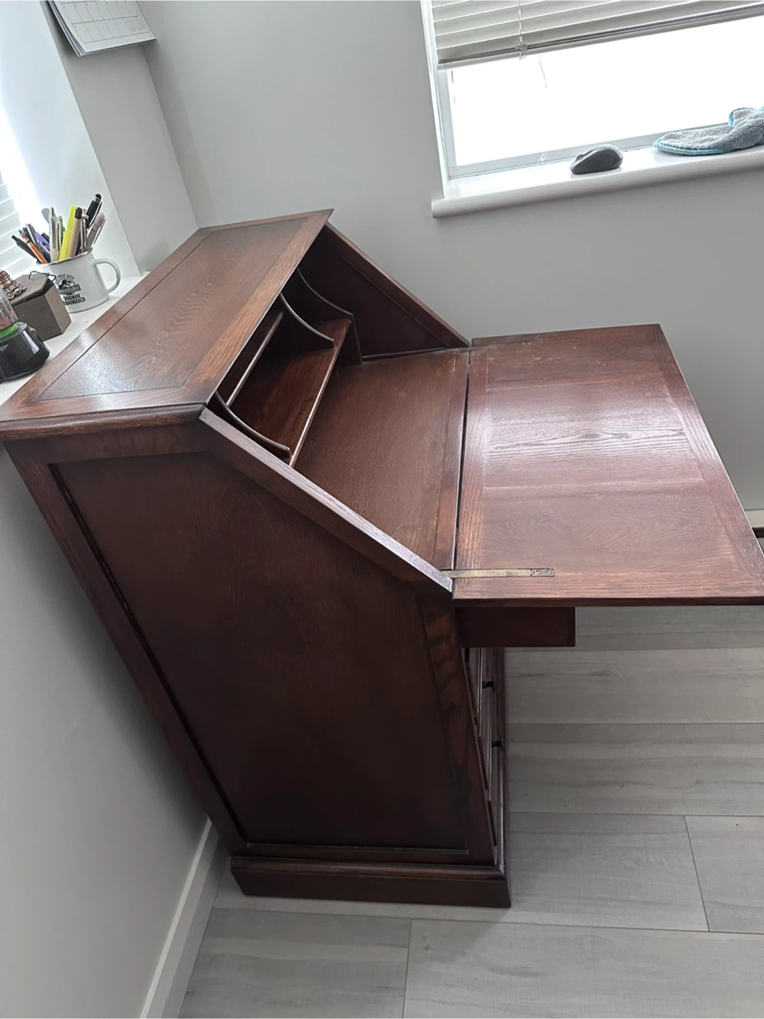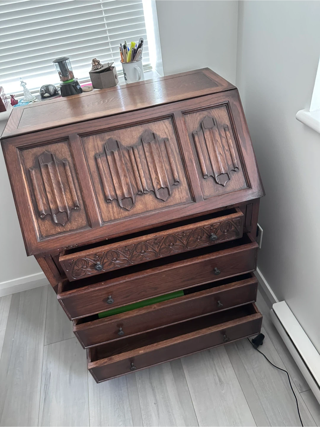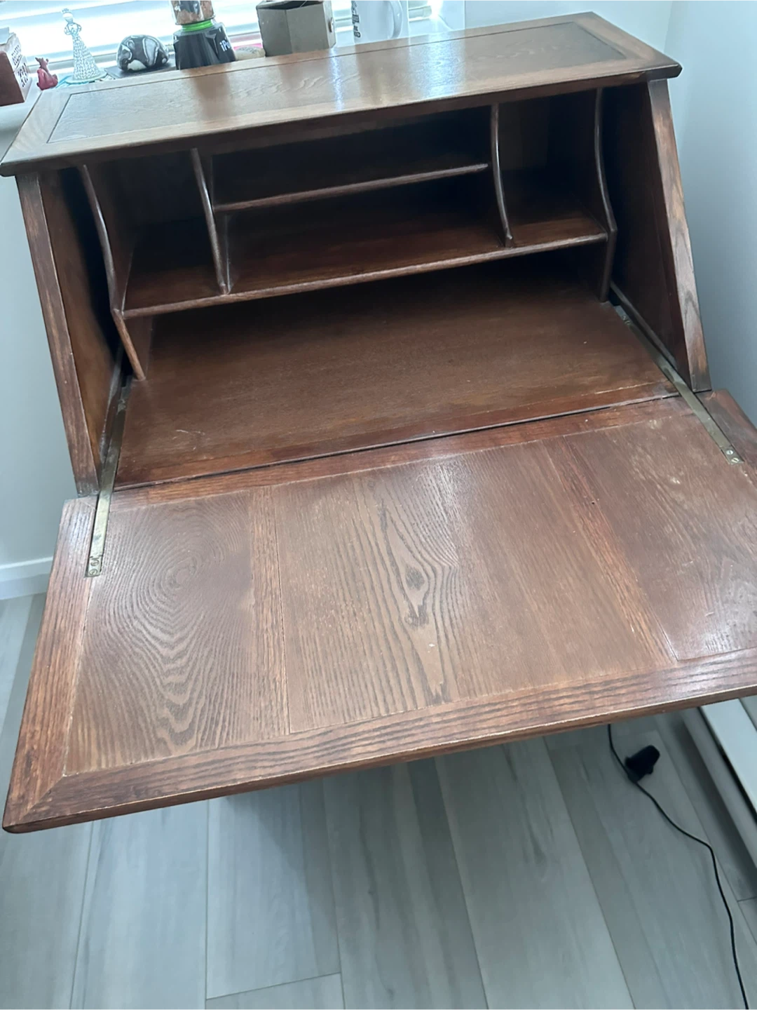 Lovely antique drop front desk in solid wood! It features a drop-down writing surface and several drawers for storage. Perfect for adding a touch of vintage charm to your home office or living space