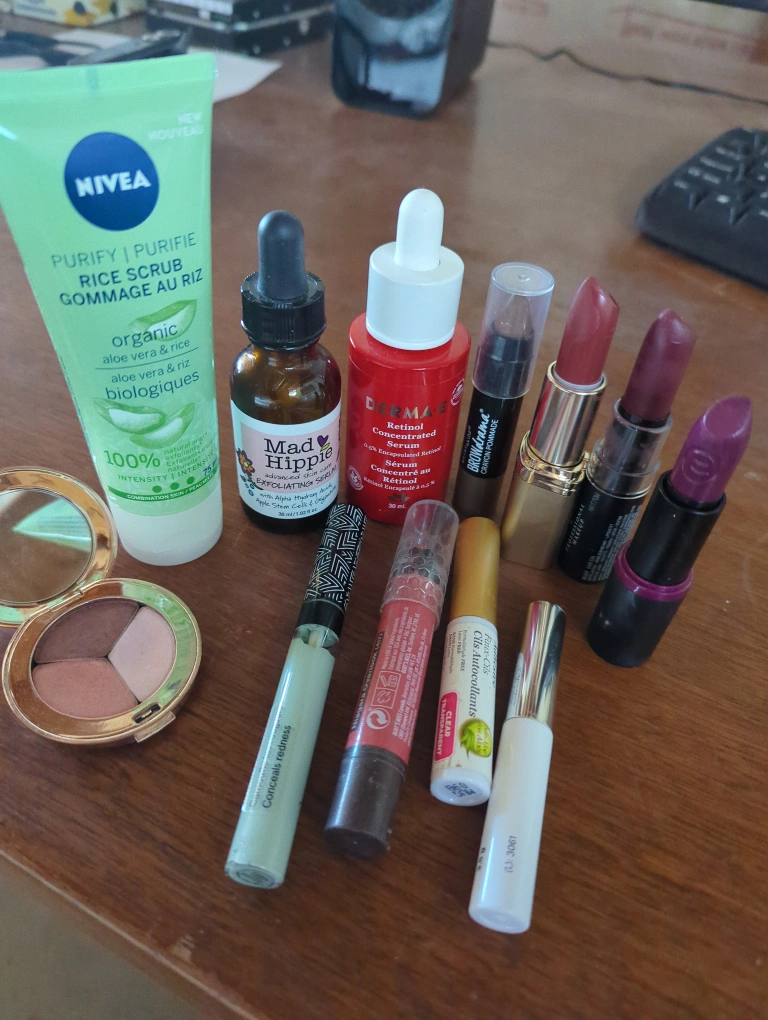 Various makeup items including foundation, lip gloss, eyeliner, lipstick, and face scrub. All new or lightly used.