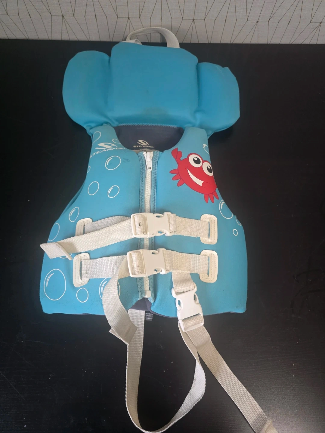 This Stearns child life vest is designed for children weighing 30-60 lbs. It's made with a durable polyester shell and a comfortable poly-fill interior. Features adjustable buckles and a zippered front for a secure fit.