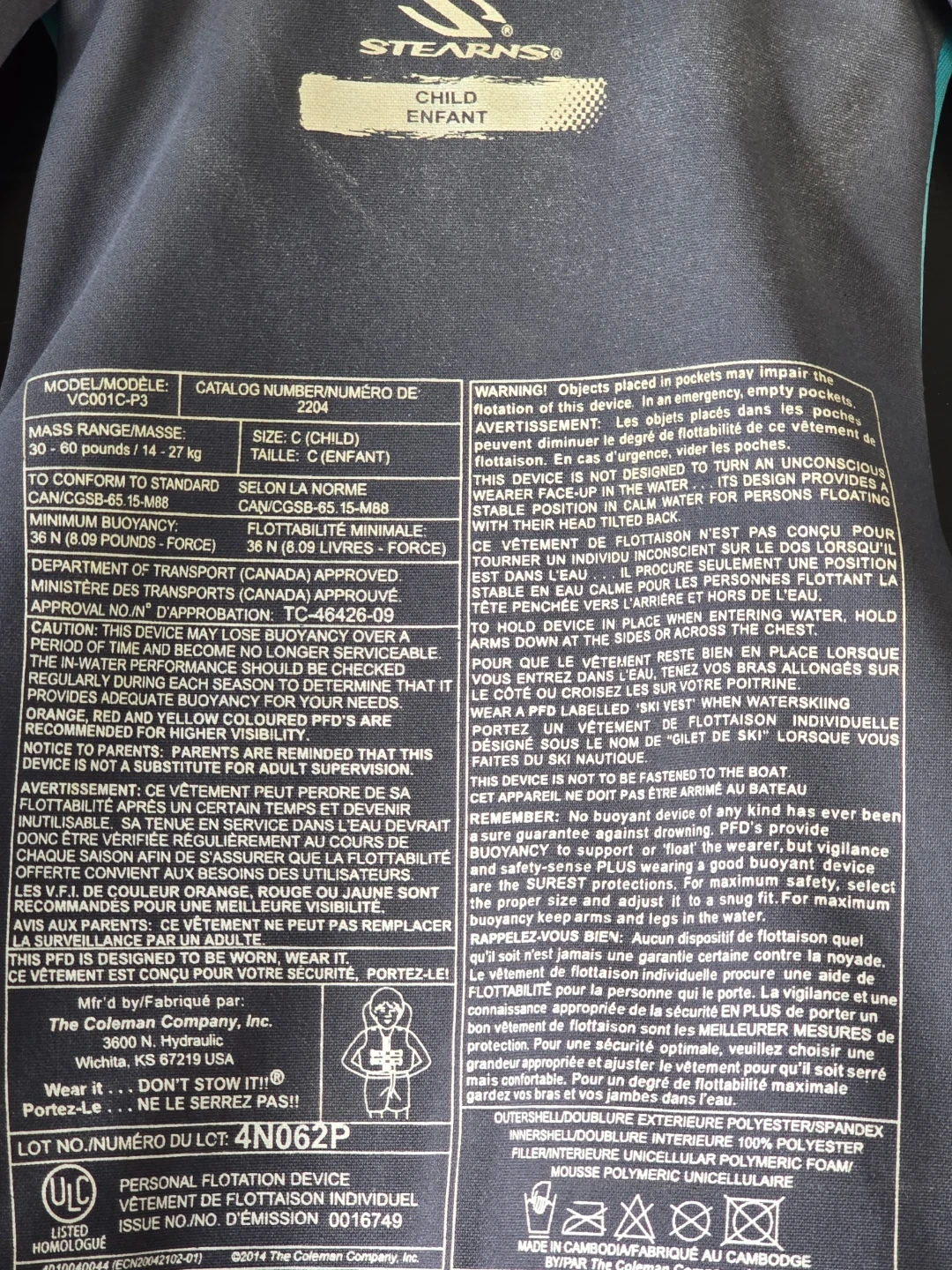 This Stearns child life vest is designed for children weighing 30-60 lbs. It's made with a durable polyester shell and a comfortable poly-fill interior. Features adjustable buckles and a zippered front for a secure fit.