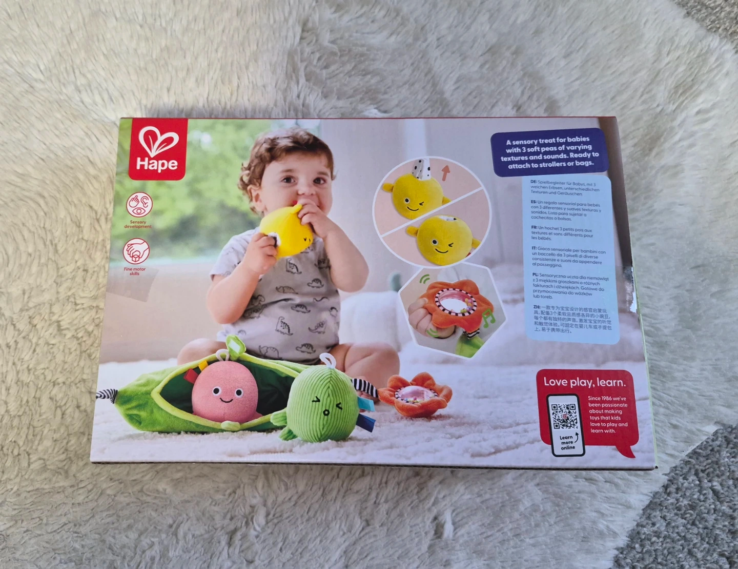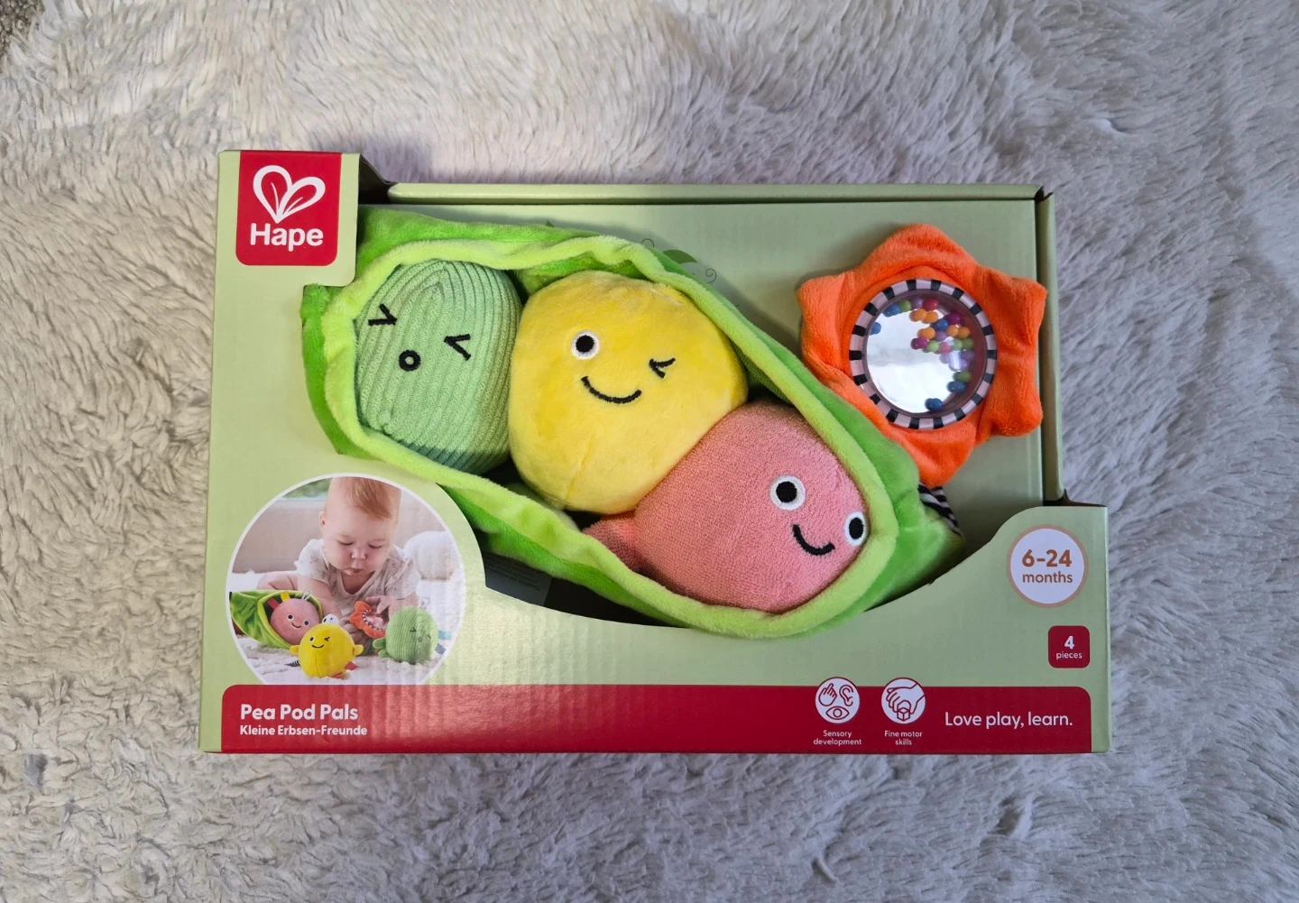 This Hape Pea Pod Pals toy features three soft peas with different textures and sounds. It's designed for babies aged 6-24 months. Great for sensory development and fine motor skills!