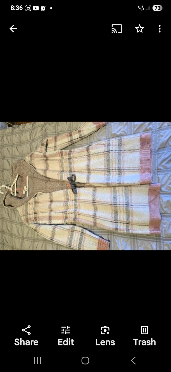 This Cupcakes and Cashmere cardigan features a plaid pattern with pink and grey accents. It's made of 48% nylon, 44% acrylic, and 8% polyester. Hand wash cold with like colours.