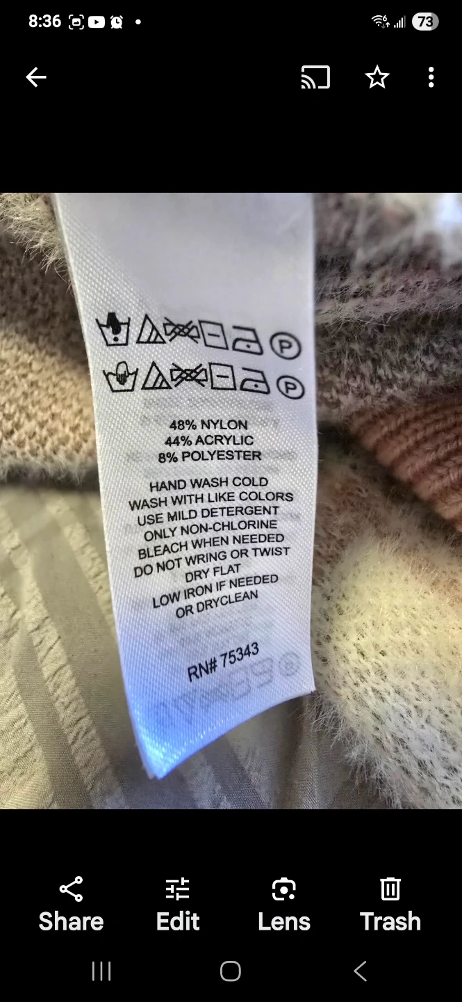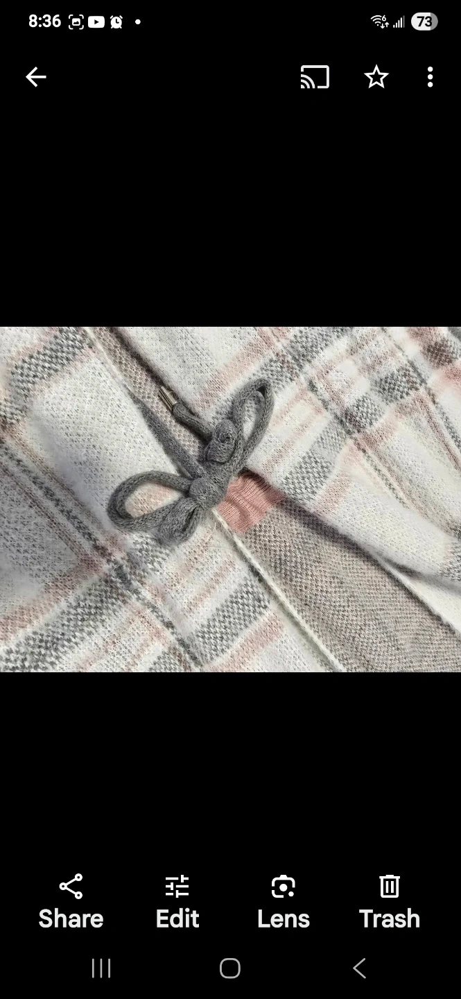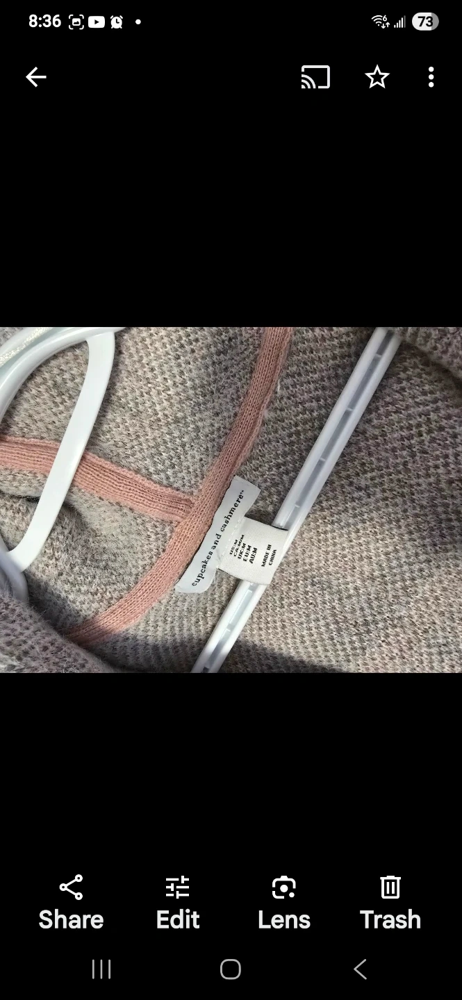 This Cupcakes and Cashmere cardigan features a plaid pattern with pink and grey accents. It's made of 48% nylon, 44% acrylic, and 8% polyester. Hand wash cold with like colours.