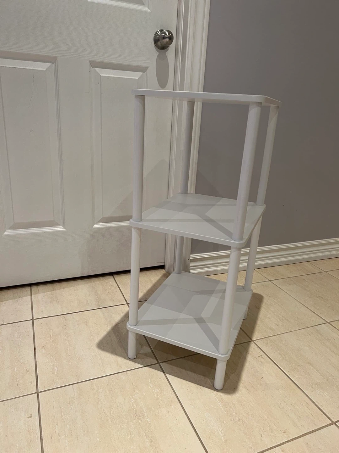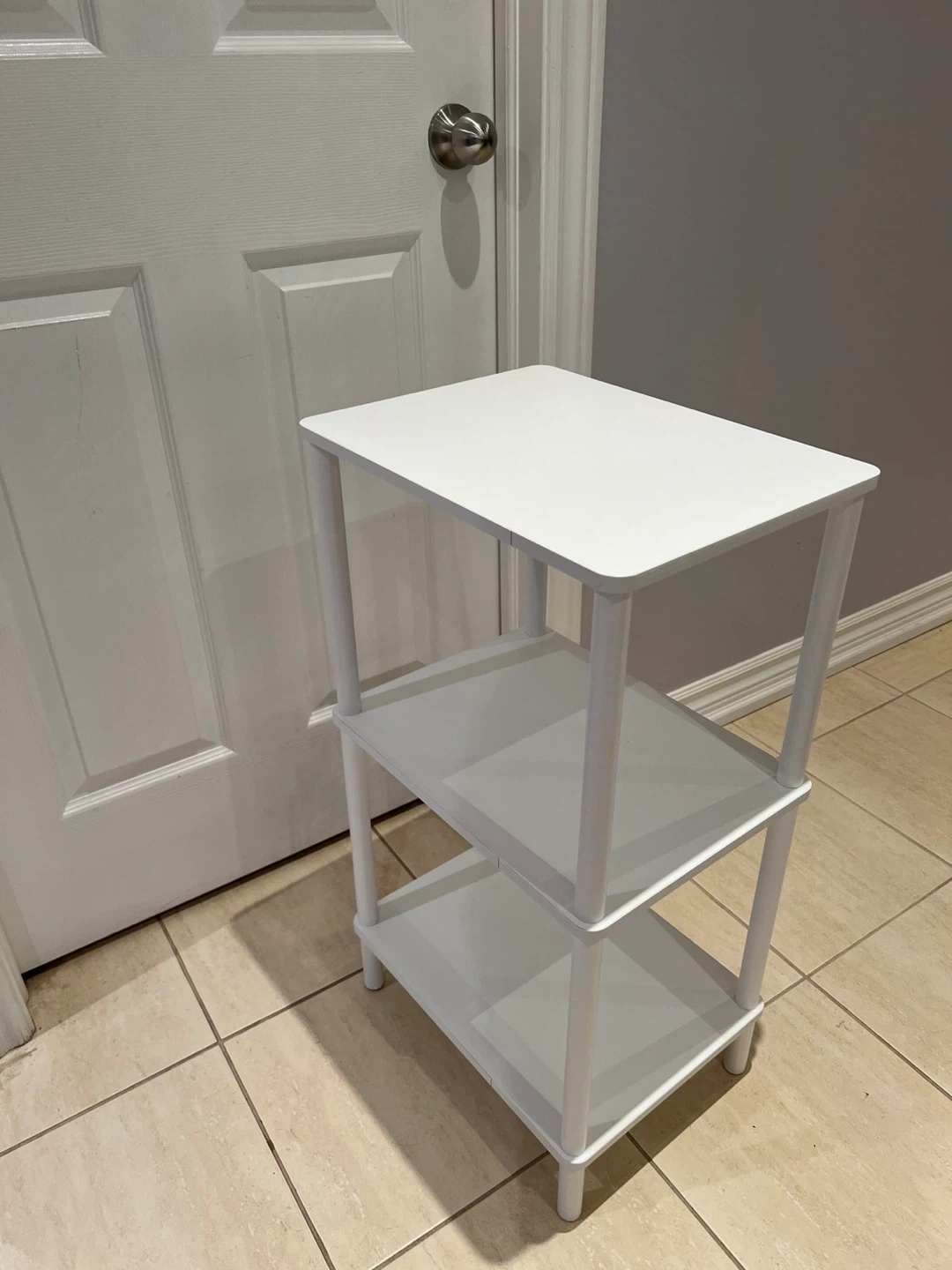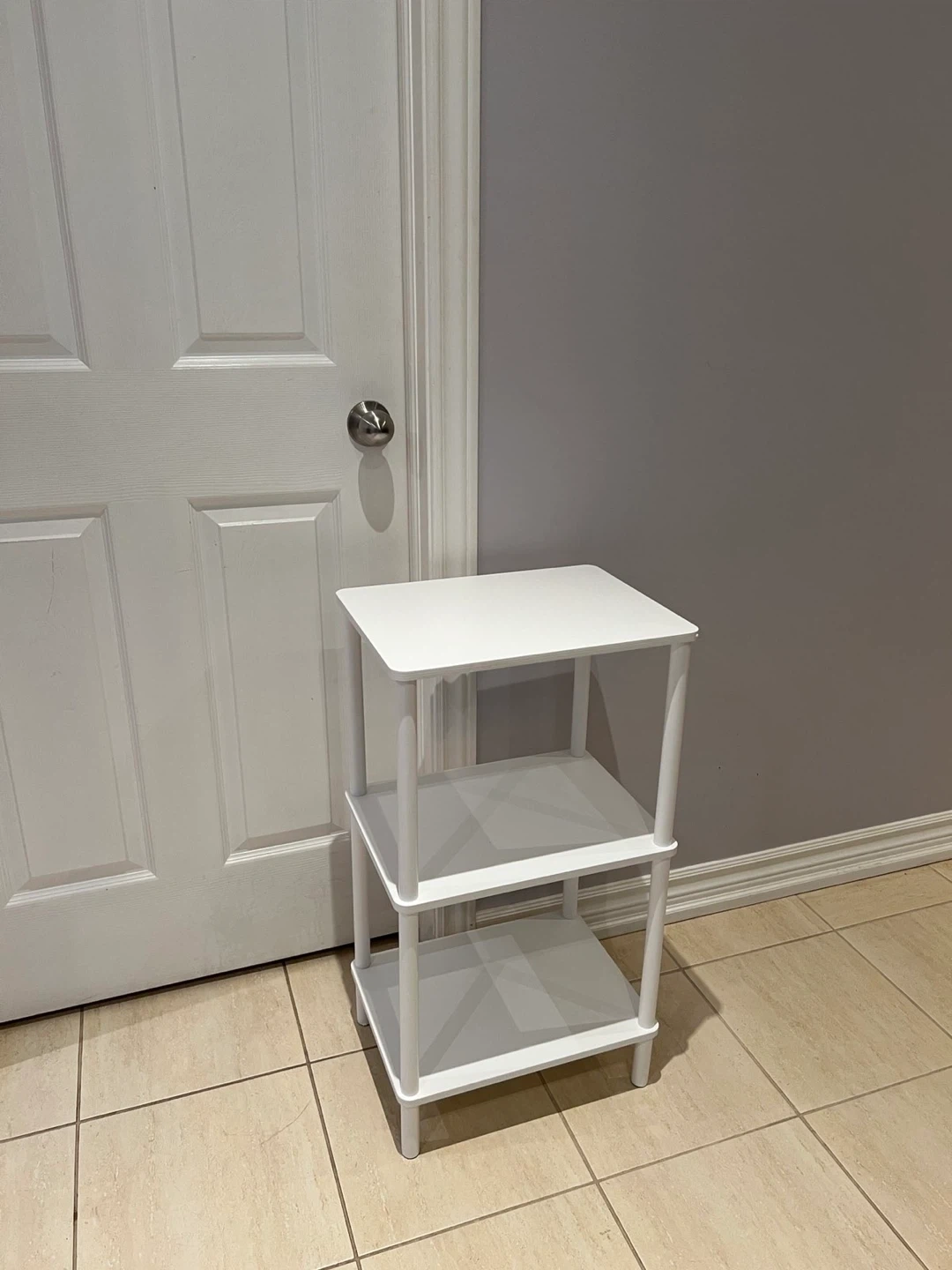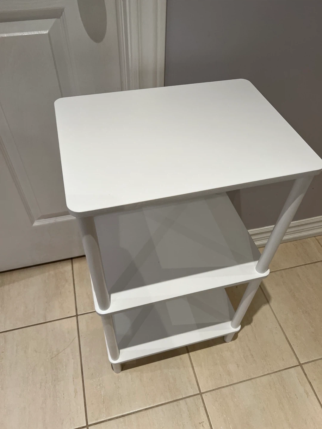 This is a simple white 3-tier side table. It's made of durable material and has a clean, modern design. Its compact size makes it handy for small spaces.