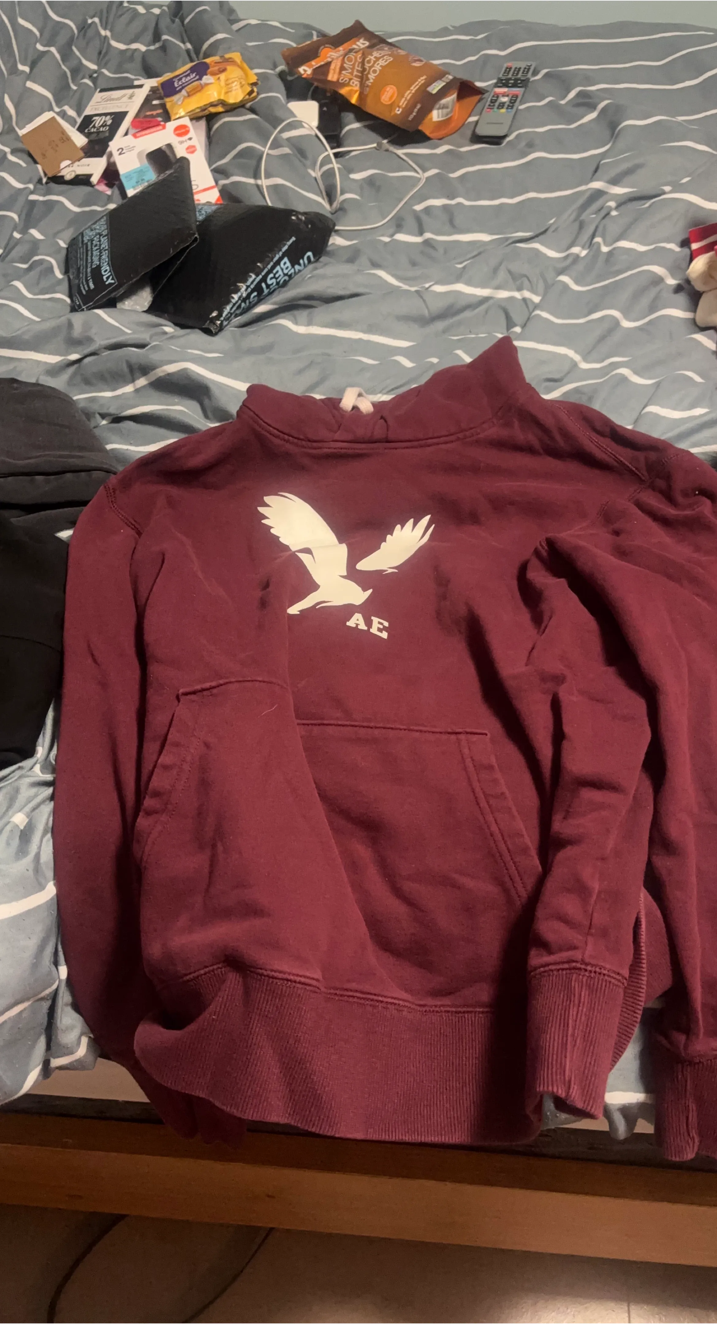 Selling a cozy American Eagle hoodie in a maroon colour! It features the classic AE logo on the front. Perfect for those chilly Canadian evenings!