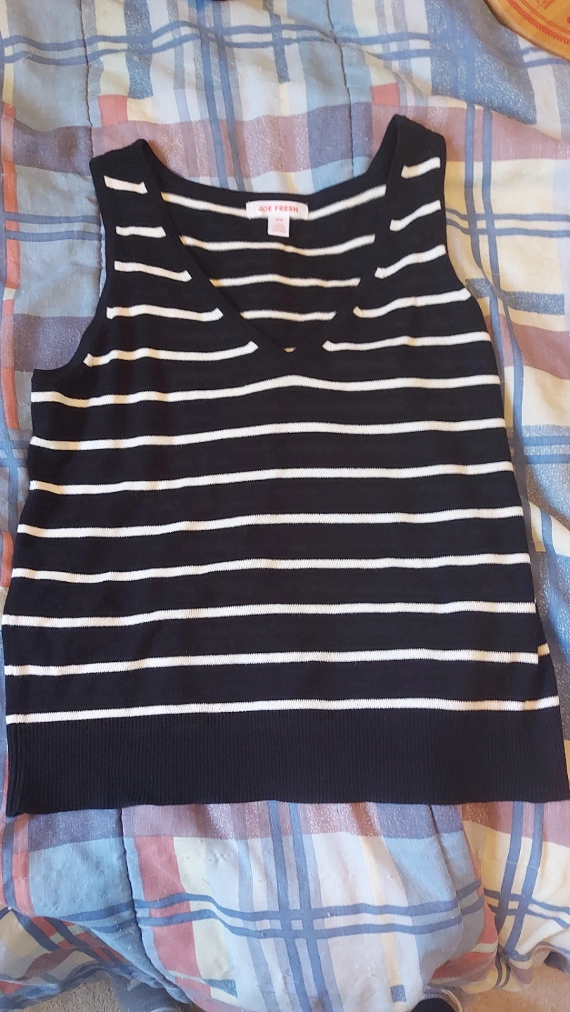 This Joe Fresh tank top features a classic black and white stripe pattern. It has a V-neckline and a sleeveless design. The material is a soft knit, perfect for layering or wearing on its own.