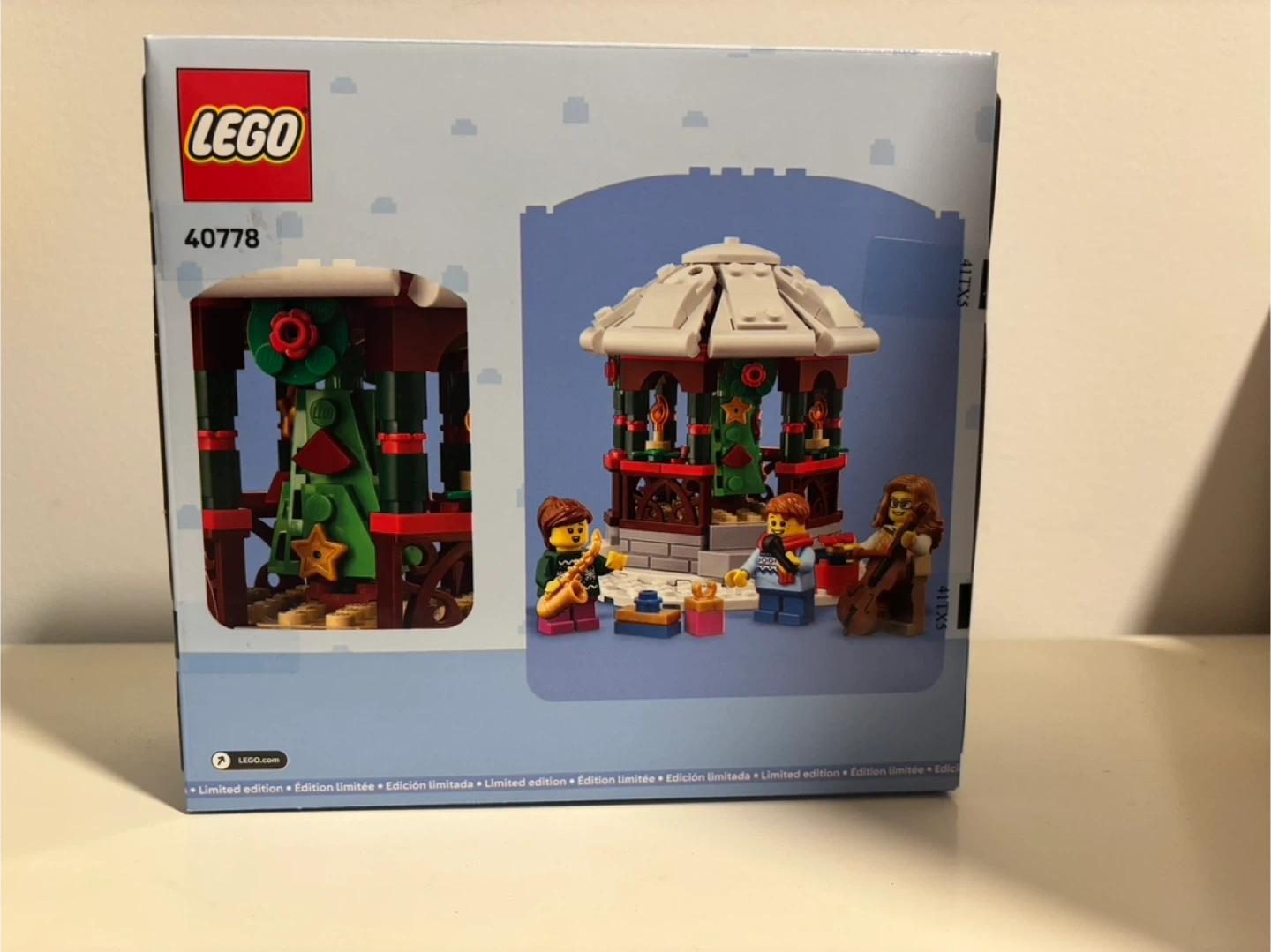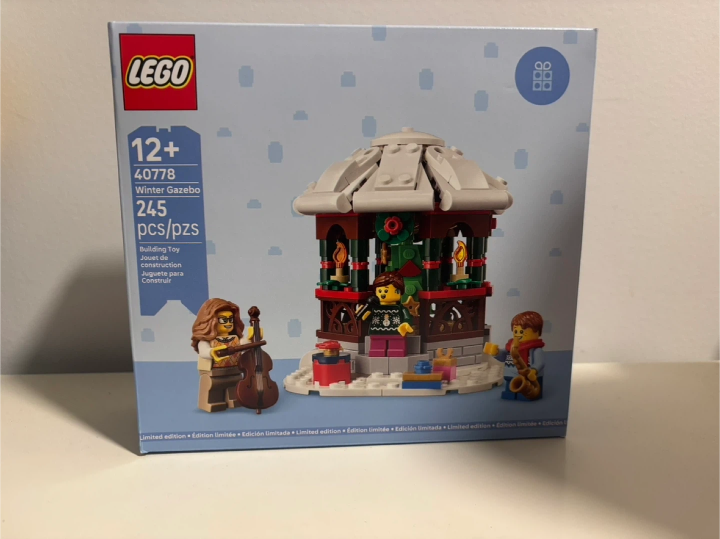 Build a festive Winter Gazebo with this LEGO set, featuring 245 pieces. It includes three minifigures with musical instruments. This set is recommended for ages 12+.