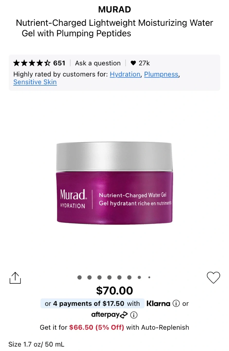 Selling a Murad Nutrient-Charged Lightweight Moisturizing Water Gel with Plumping Peptides. This is a hydrating gel that's great for sensitive skin. It's a lightweight formula that absorbs quickly, leaving your skin feeling plump and refreshed. Size is 1.7 oz/ 50 mL.