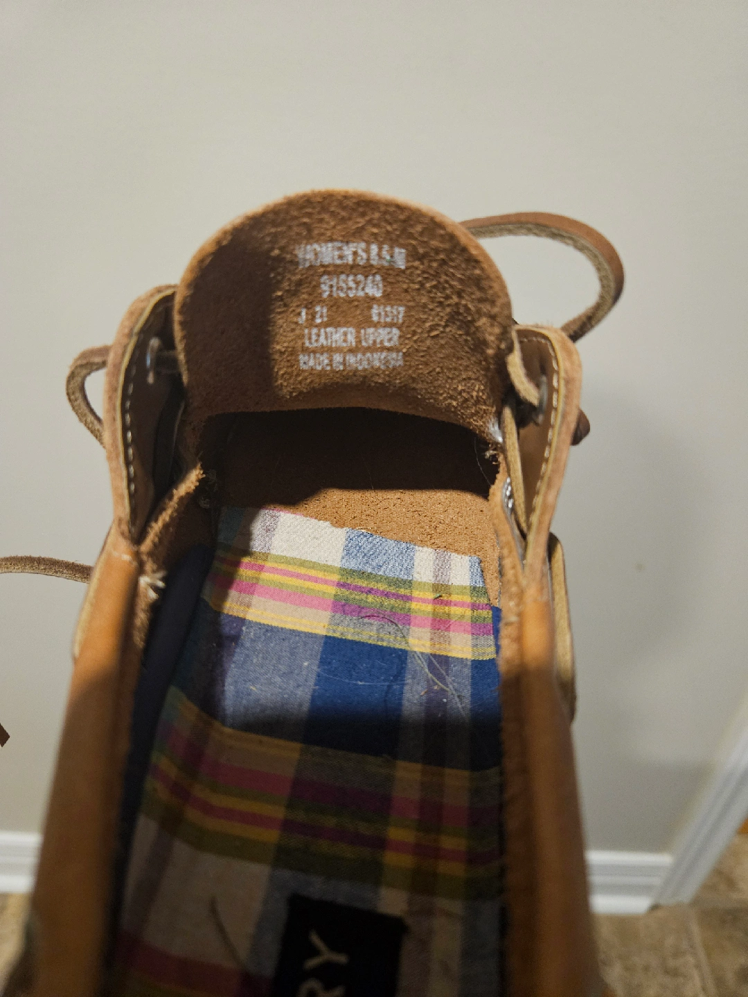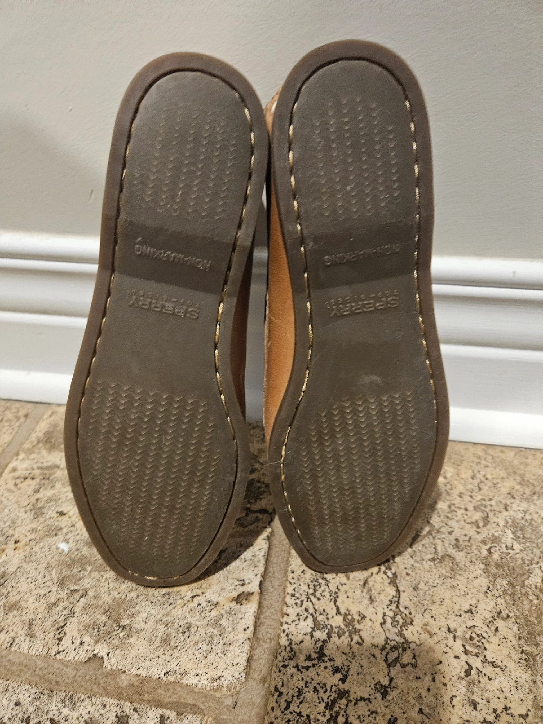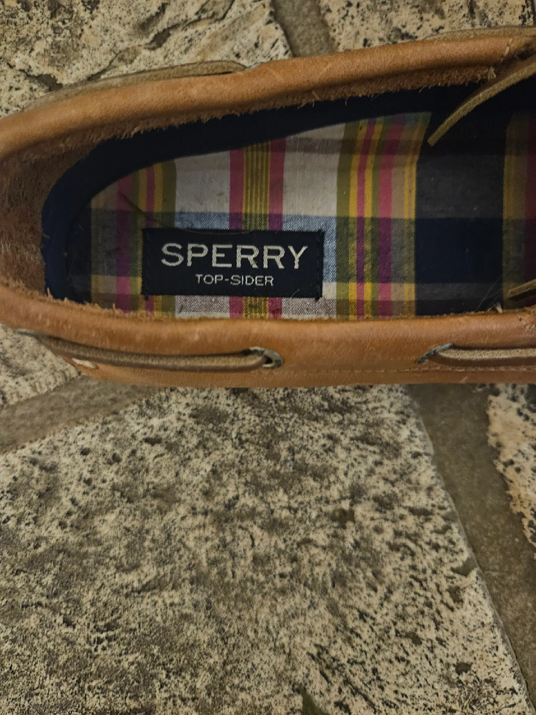 Selling a pair of Sperry Top-Sider boat shoes in women's size 8.5M. They're made of leather and are in good condition. Perfect for a classic, nautical look!