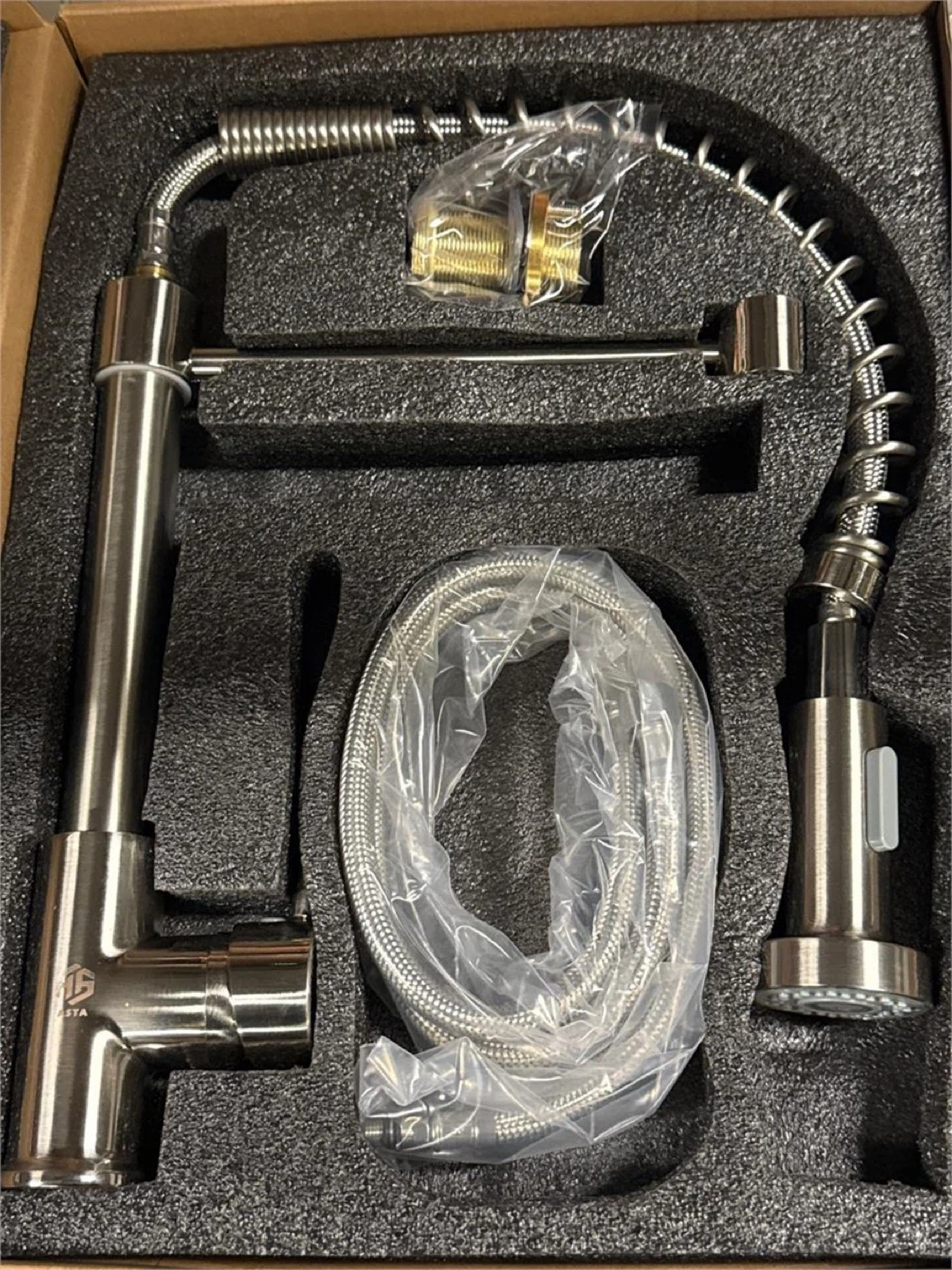 Retail $125.00 | ASTA Single Handle Pull Down Spray Kitchen Faucet. AS- 3520 BODY - BRASS COLOR - BRUSHED HOT / COLD FUNCTION HOSE - SS | New
