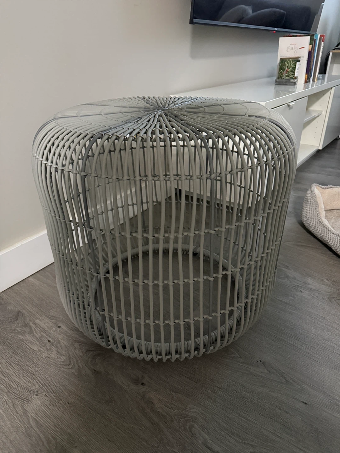 This grey woven side table or stool adds a natural touch to your space. It's constructed from woven material, offering a durable and stylish accent piece. This item could be useful as a small table or extra seating.