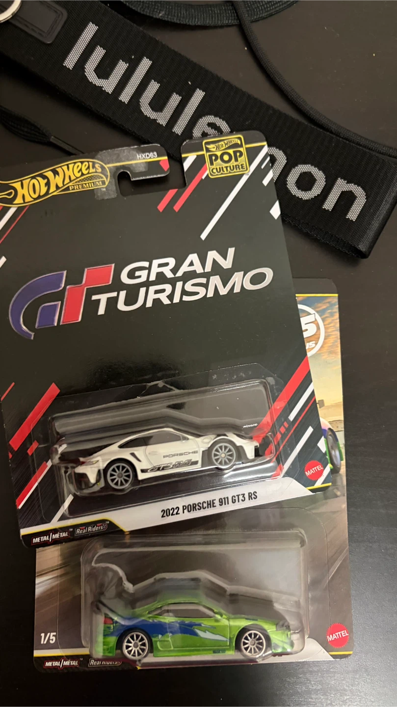 This is a Hot Wheels Premium die-cast model featuring the 2022 Porsche 911 GT3 RS from the Gran Turismo series. It's made with Metal and Real Riders components.