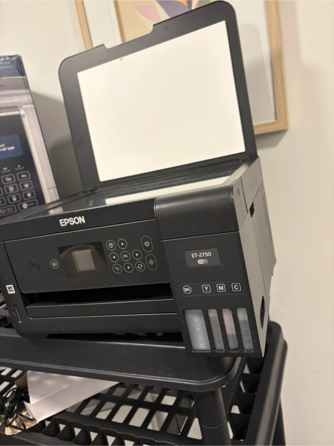 This is an Epson ET-2750 EcoTank all-in-one printer. It offers wireless printing and copying capabilities. Built-in ink tanks reduce the need for frequent cartridge replacements.