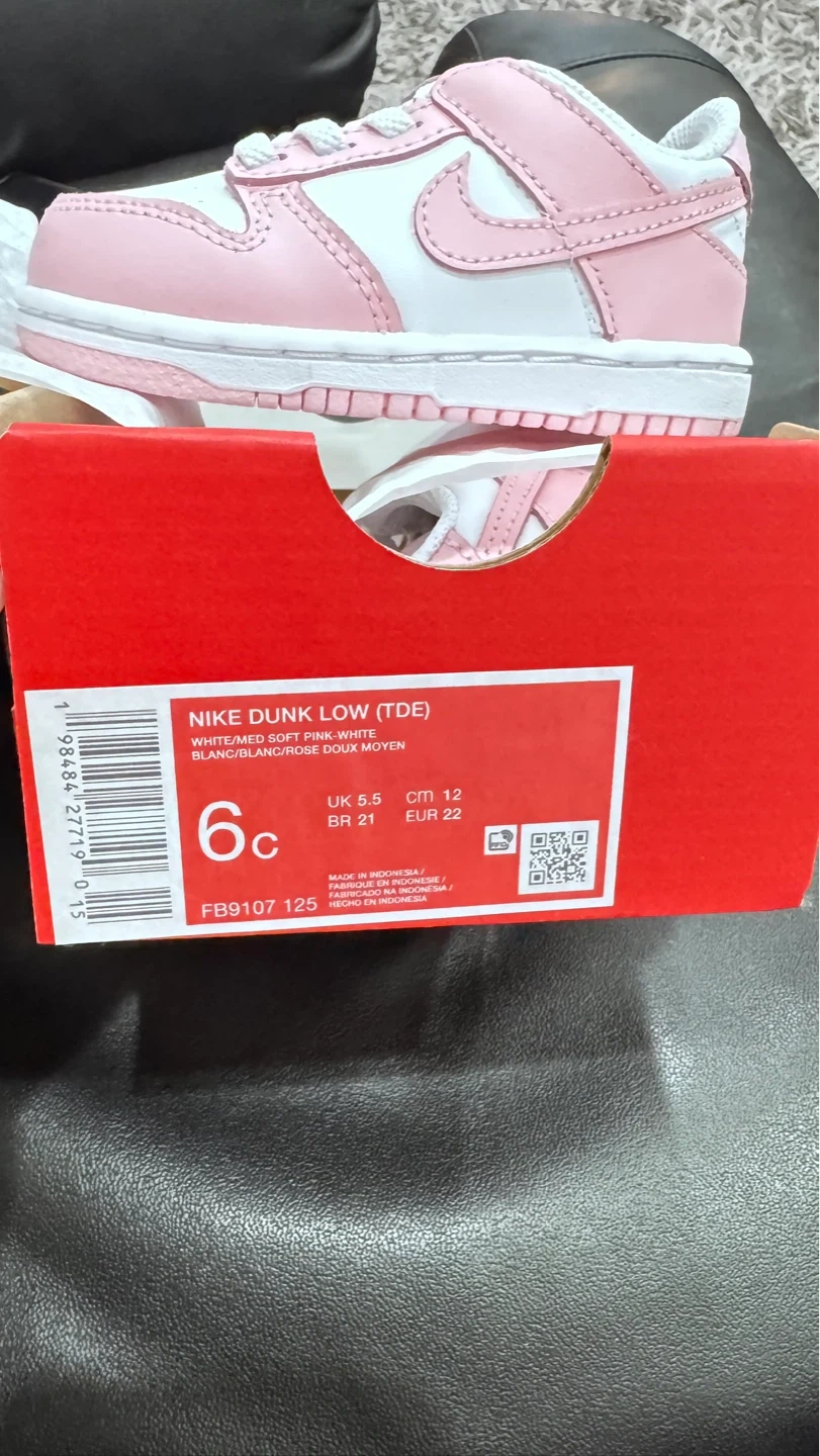 These are girls' toddler Nike Dunk Low sneakers in pink and white. They're a size 6c, UK 5.5, EUR 22. Includes original box.