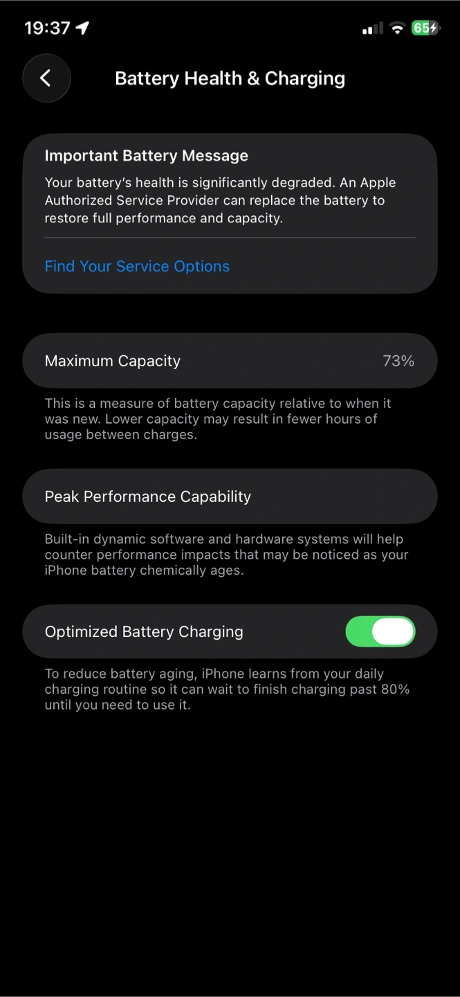 This is an Apple iPhone 11 in white. The maximum battery capacity is 73%. It has optimized battery charging enabled.