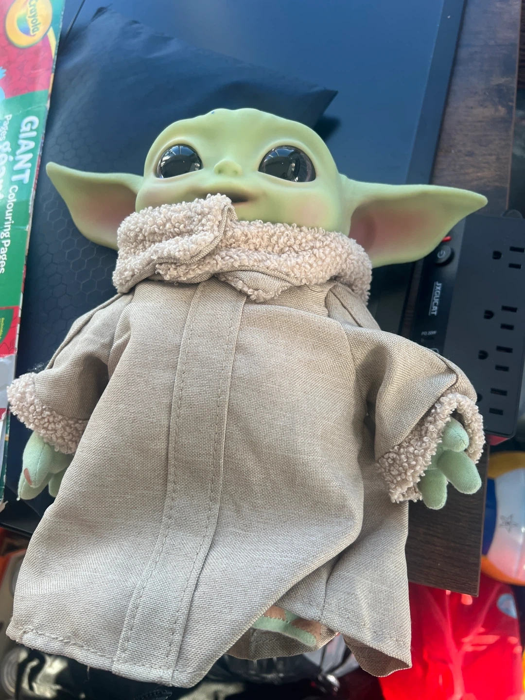 This is a plush toy of The Child, also known as Baby Yoda, from Star Wars. It's wearing its signature robe. It's made of soft fabric, perfect for fans of the Mandalorian.
