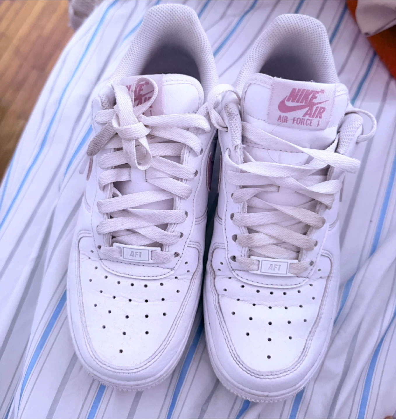 Selling a pair of Nike Air Force 1 sneakers in white with pink accents. They're in good condition and ready for a new owner! Size is women's.
