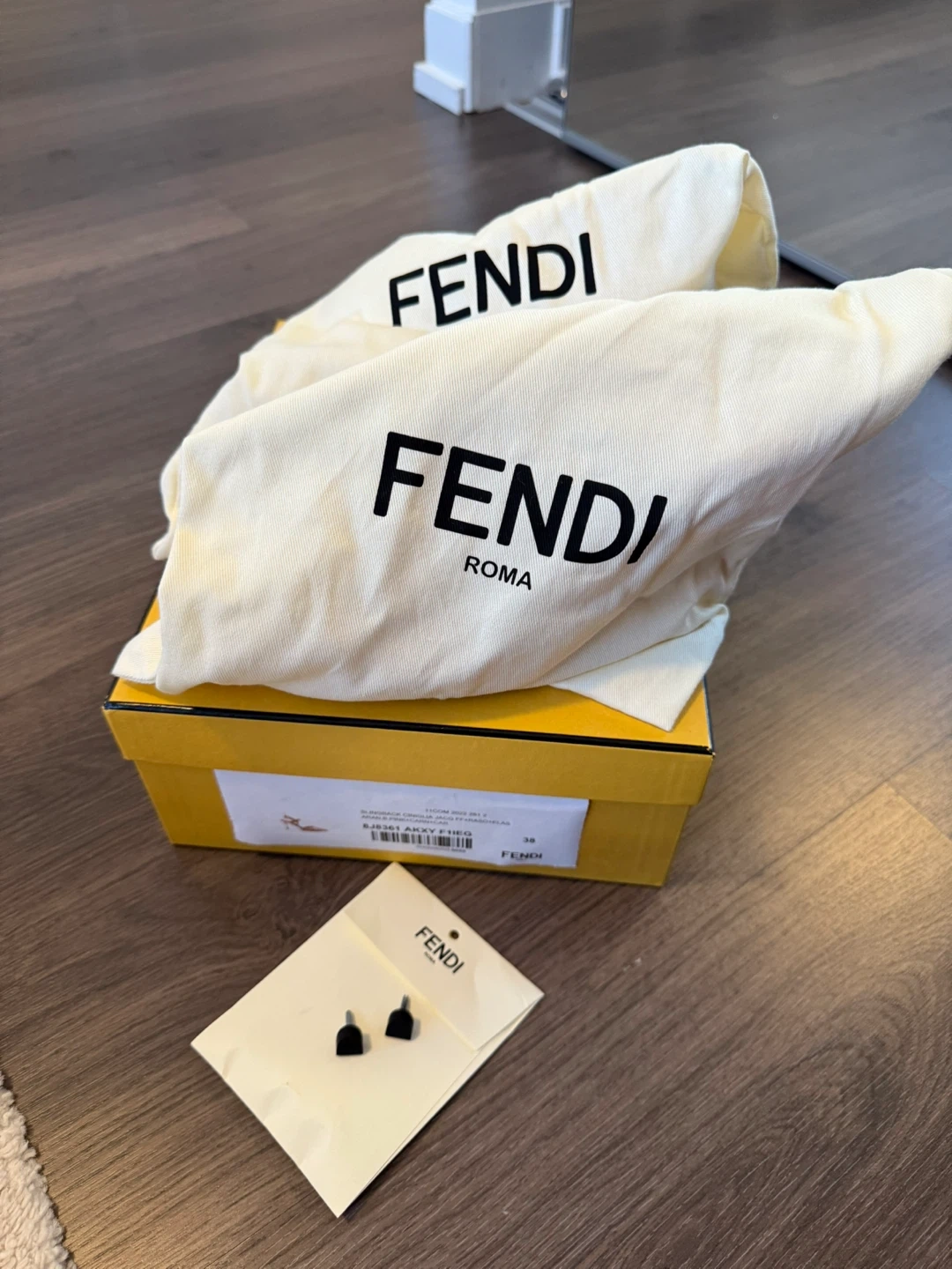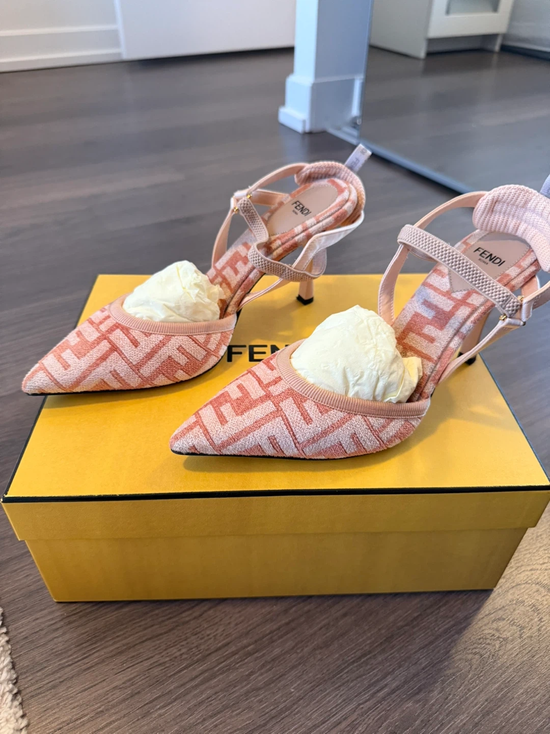 These Fendi slingback heels feature the iconic FF monogram pattern in pink and white. They come with the original box, dust bags, and extra heel tips. A stylish addition to any wardrobe!