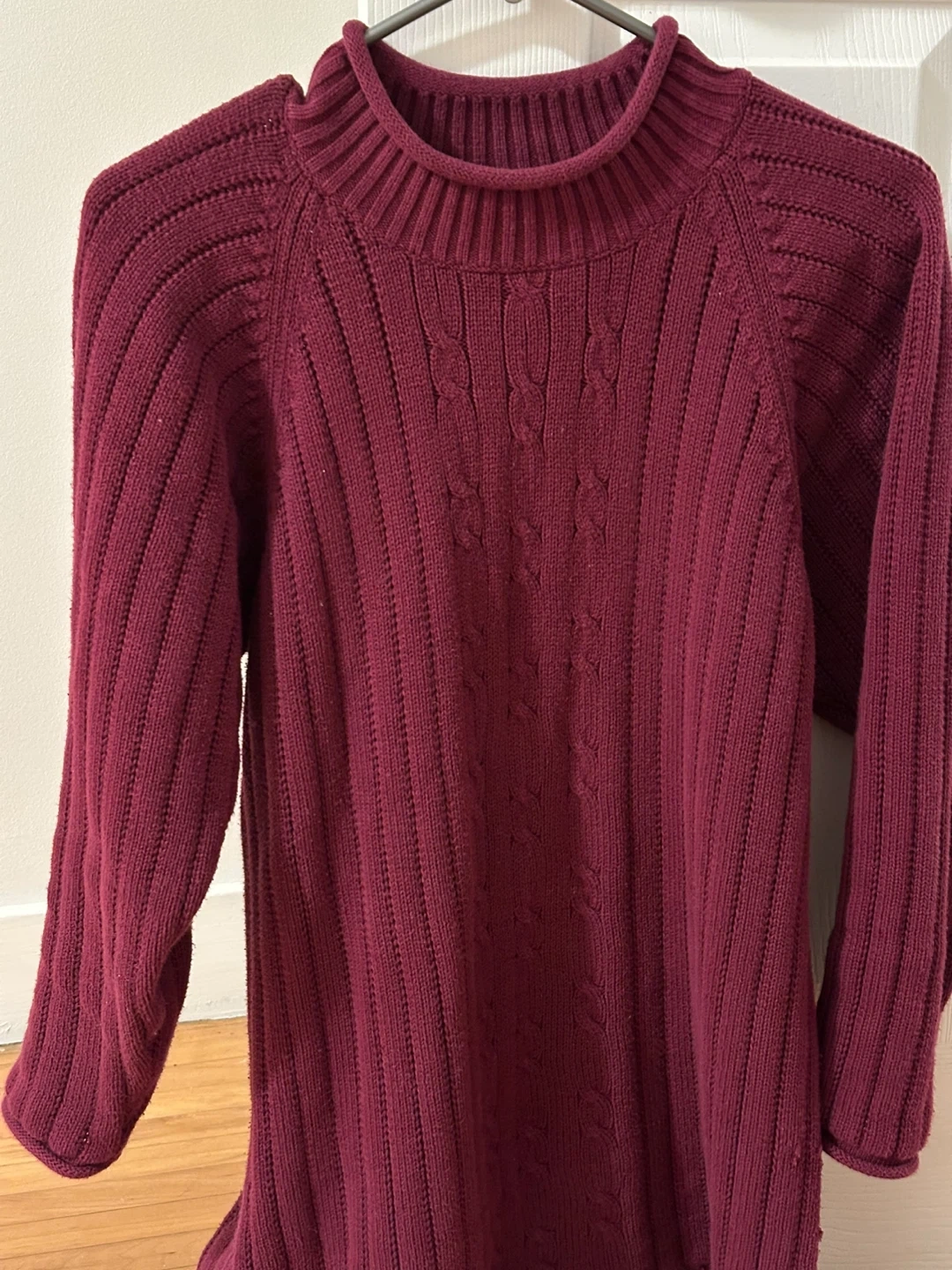 Cozy knit sweater in a deep burgundy colour. It features a mock neck and cable knit detailing on the front. This sweater's ribbed texture adds a touch of warmth and style. Perfect for layering during cooler weather!