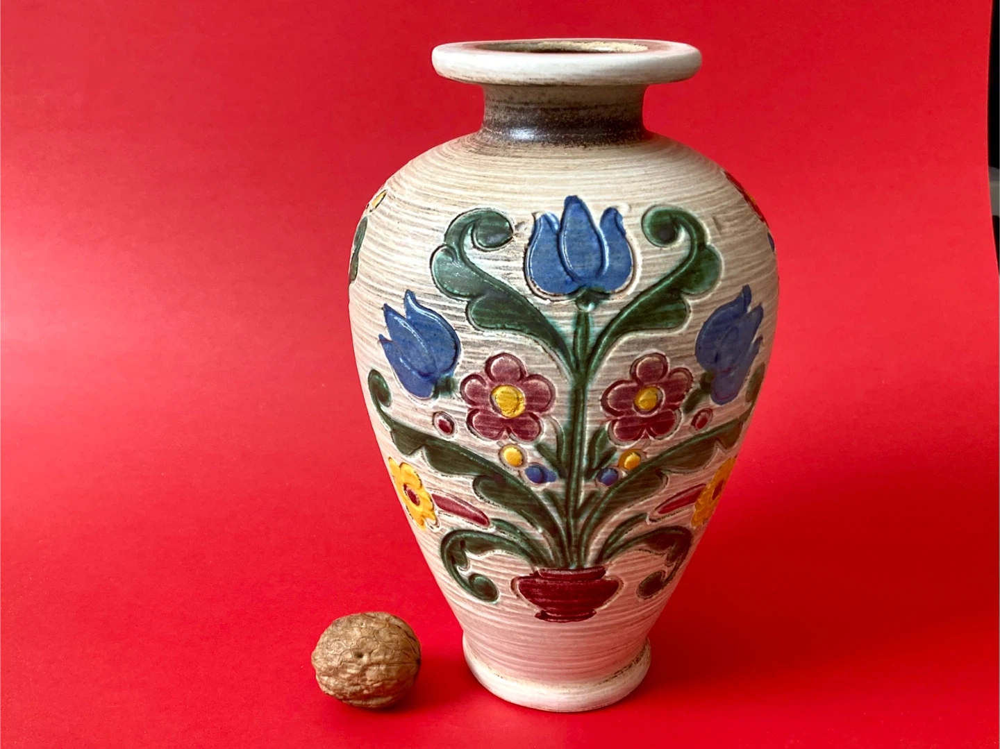 - featuring engraved details depicting deep blue tulips, green leaves, and colorful yellow and red floral accents in a folk art style with a rustic finish and earthy beige tones on the base