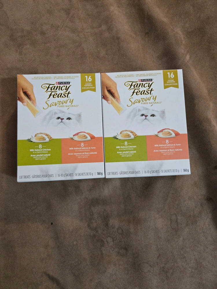 Two boxes of Purina Fancy Feast Savoury cat treats. Each box contains 16 sachets, 8 of each flavour: chicken and salmon & tuna. Puree Naturals. Both for 10