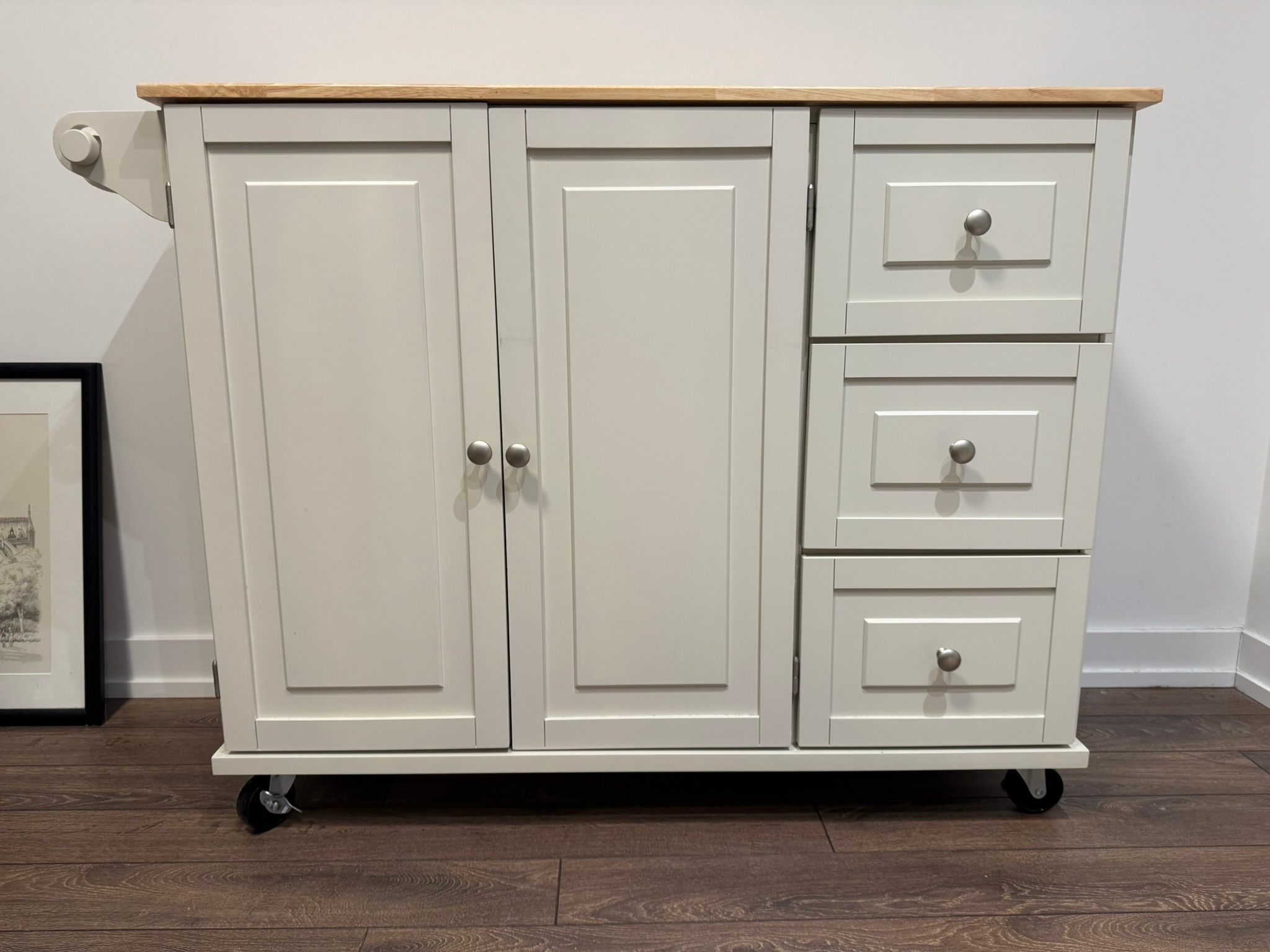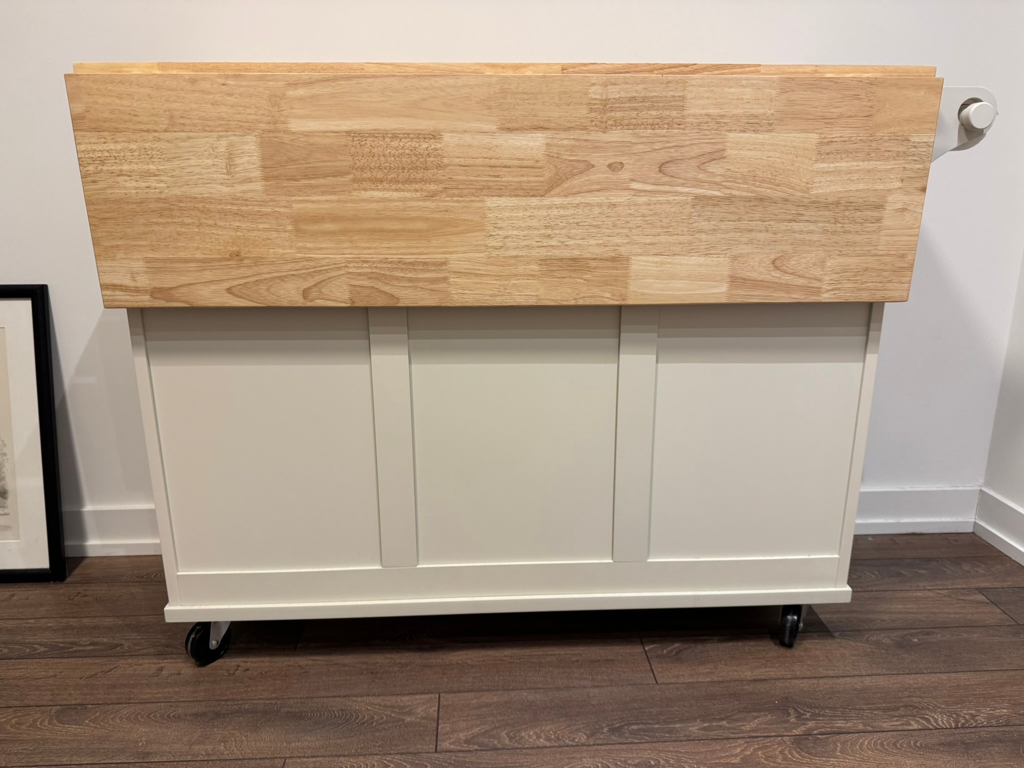 Compact kitchen island with foldout leaf for additional tabletop space. Used like new in a smoke- and pet-free home.