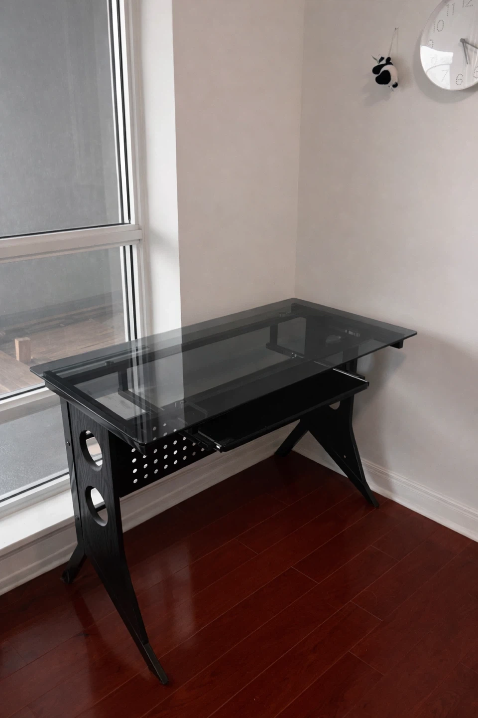 This is a sleek black computer desk with a glass top and a built-in keyboard tray. It features a modern design with perforated side panels and curved legs. The desk offers ample surface space for a monitor and other work essentials.