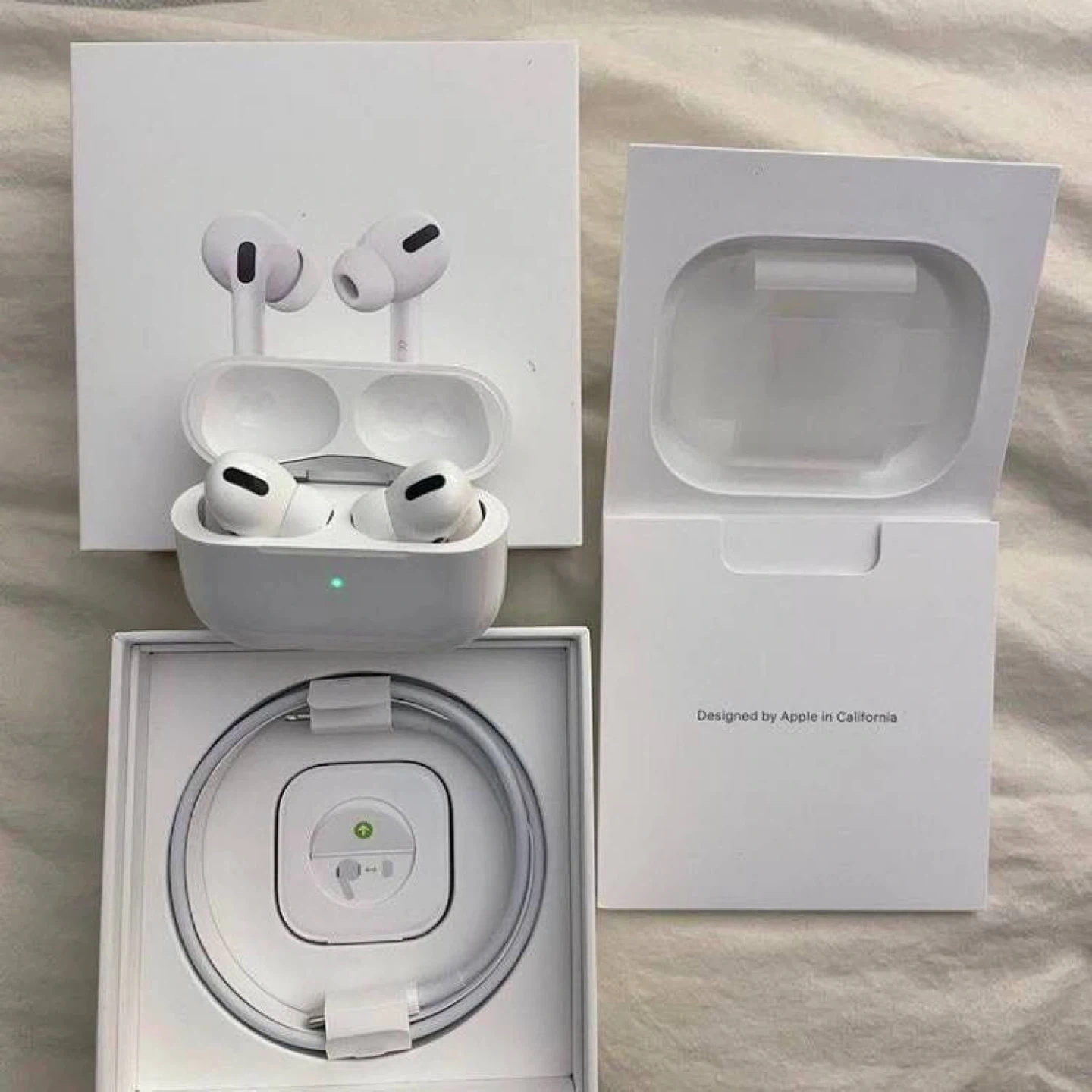 Original Apple AirPods Pro with charging case. Includes charging cable. Designed by Apple in California. These wireless earbuds offer active noise cancellation and a comfortable fit.