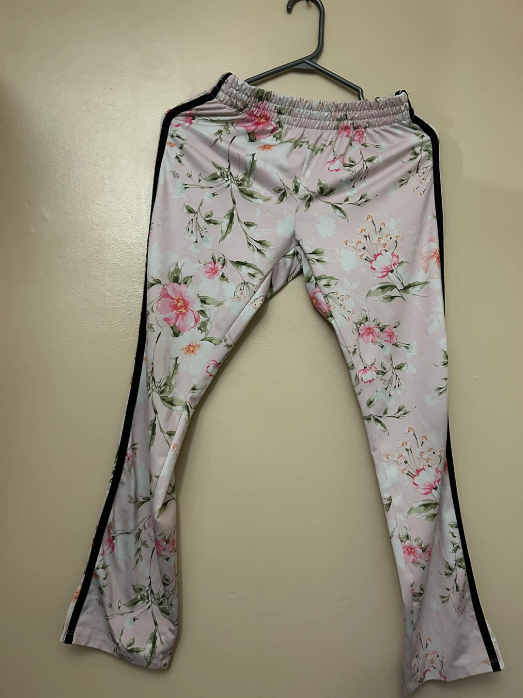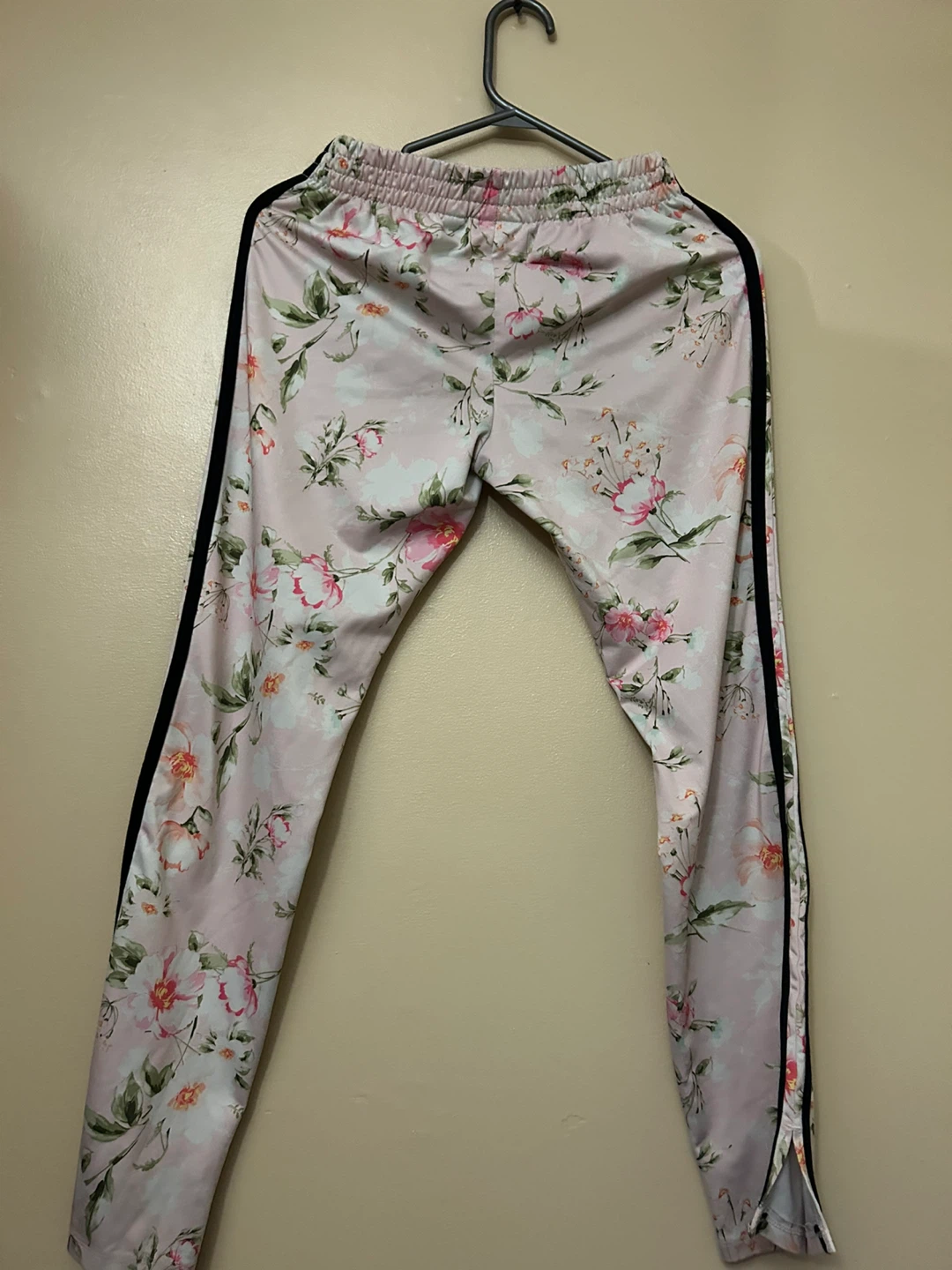 Add a touch of floral to your wardrobe with these stylish track pants! Featuring a light pink floral pattern and sporty black side stripes, these pants are both fashionable and comfortable. They're in good condition and ready for a new home.