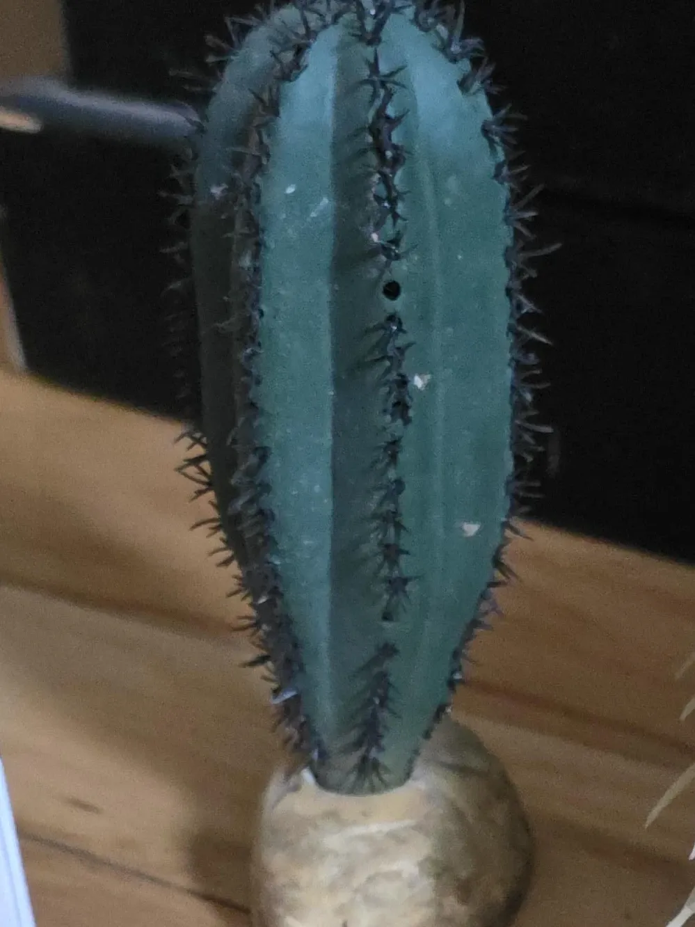 This is a decorative artificial cactus plant. It features green plastic segments and dark spikes. The base is a light brown, textured pot.