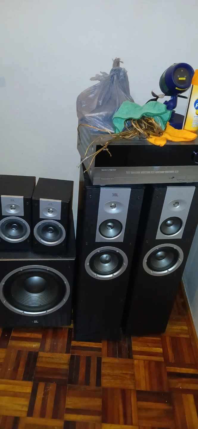 Selling a JBL home theater speaker set. It includes a subwoofer, two large speakers, and two smaller speakers. Perfect for upgrading your home entertainment system!