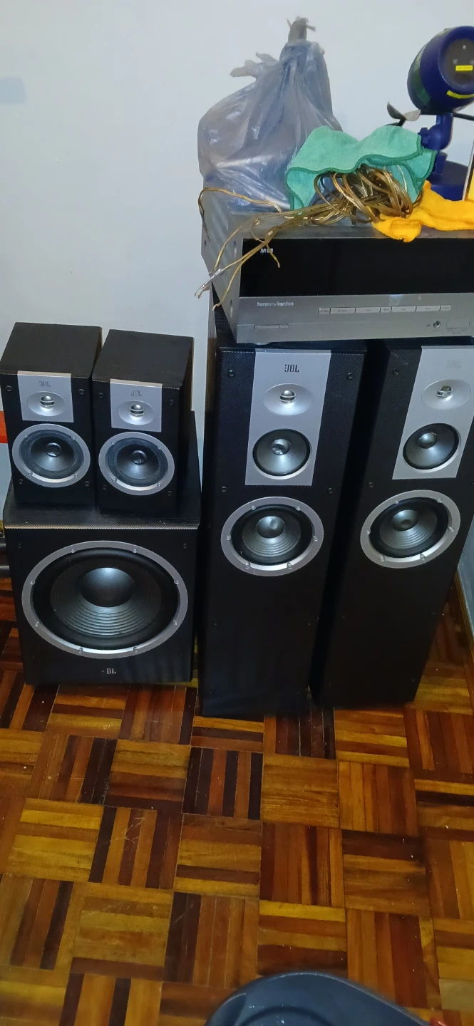 Selling a JBL home theater speaker set. It includes a subwoofer, two large speakers, and two smaller speakers. Perfect for upgrading your home entertainment system!