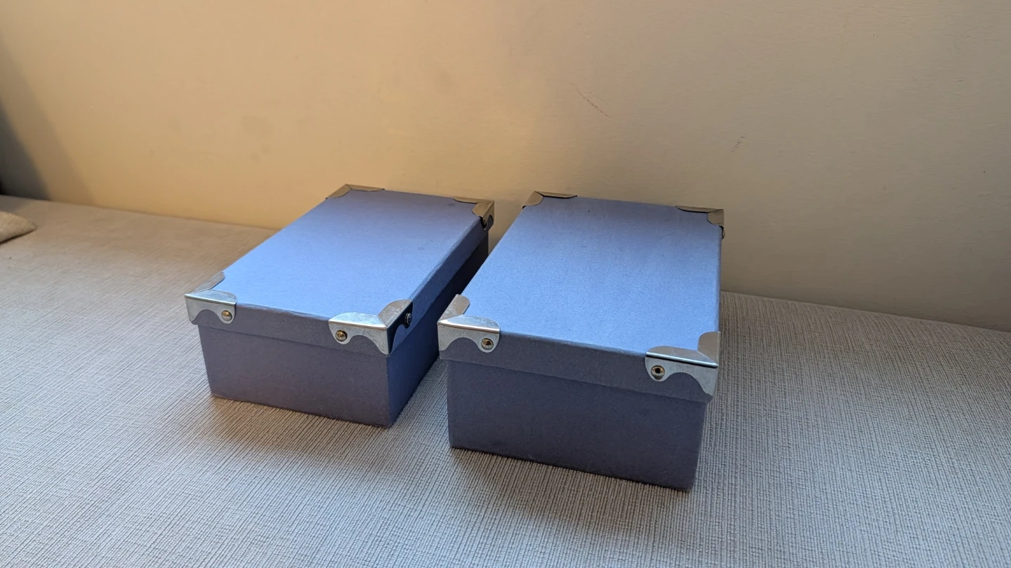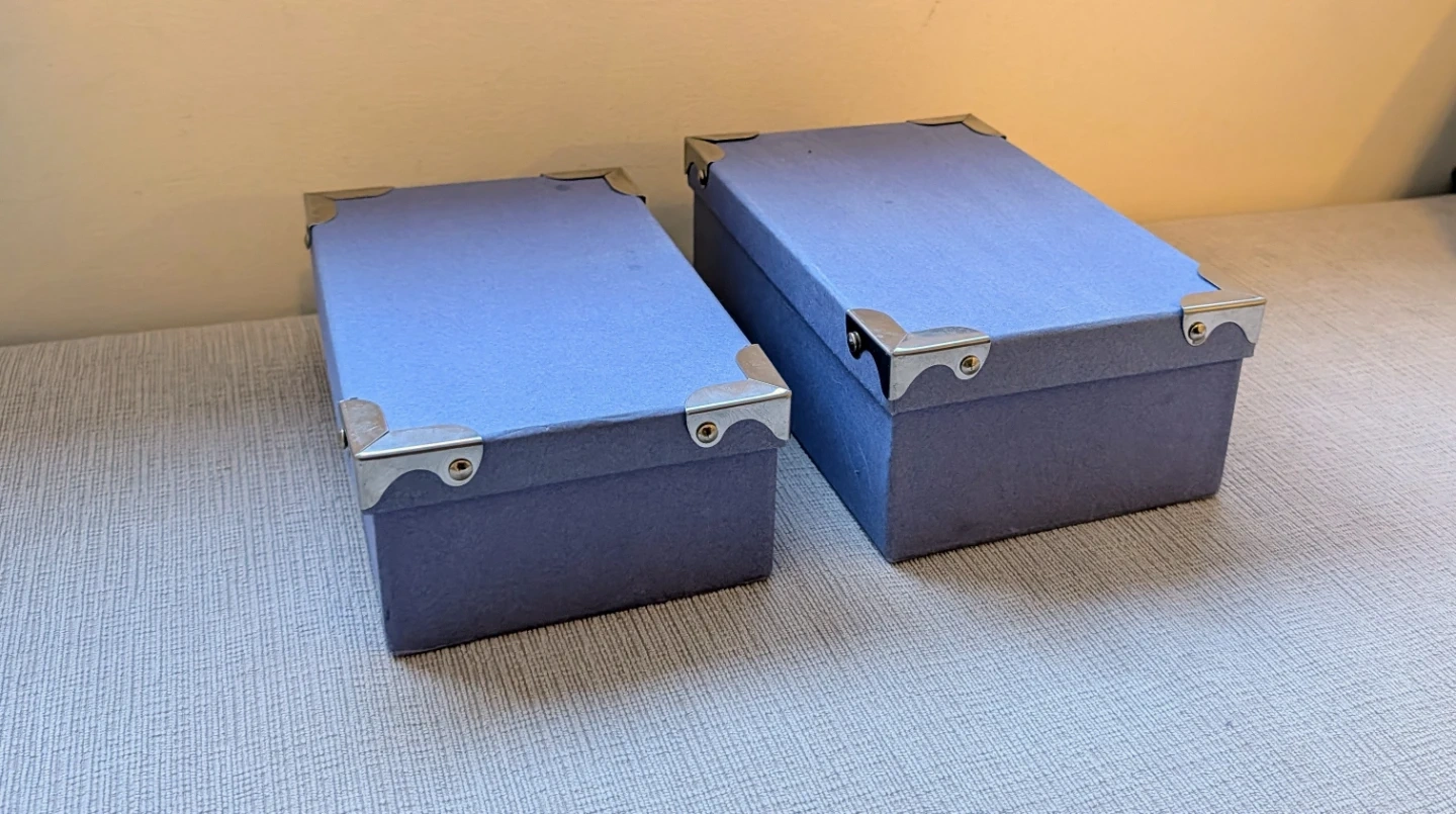 Selling a set of two blue storage boxes. They're great for organizing small items. Each box has reinforced metal corners for durability. They're perfect for tidying up shelves or closets!