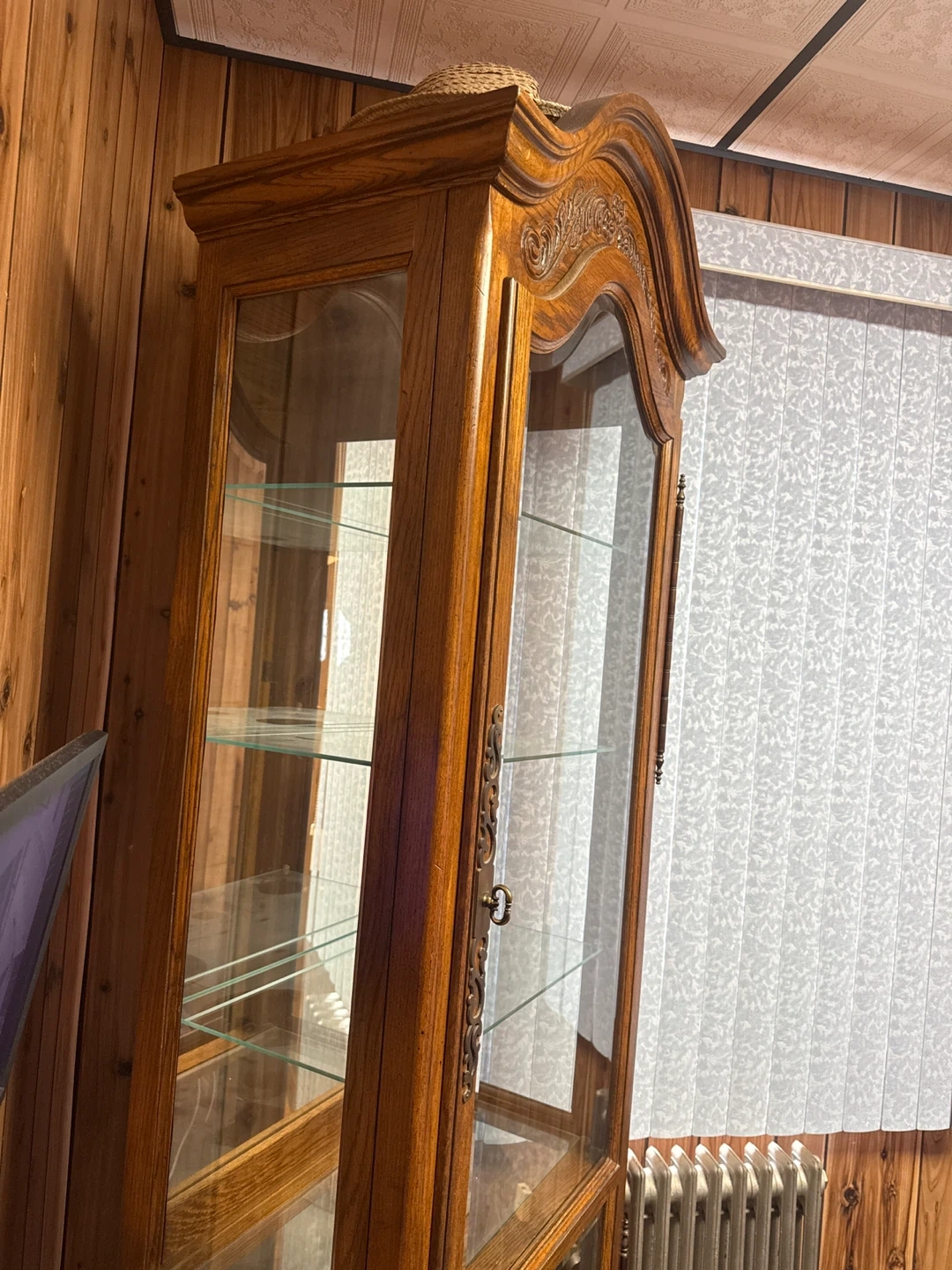 This is a beautiful wooden display cabinet with glass doors and shelves. It's perfect for showcasing collectibles or decorative items. The cabinet features ornate detailing and sits on carved wooden legs. Multiple glass shelves provide ample display space.with lighting from above