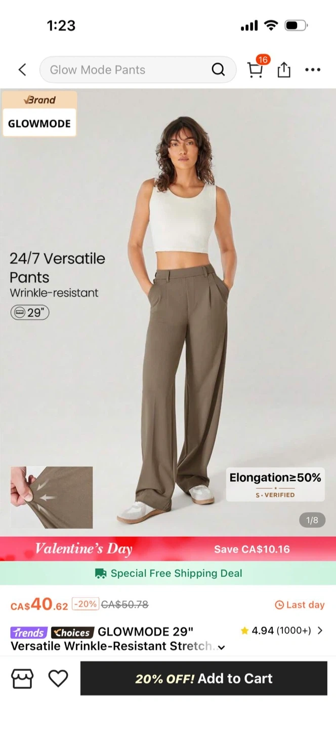 Glowmode 24/7 versatile pants in a size medium. These are wrinkle-resistant with a wide leg fit. They're made with 82% polyester and 18% elastane for stretch.