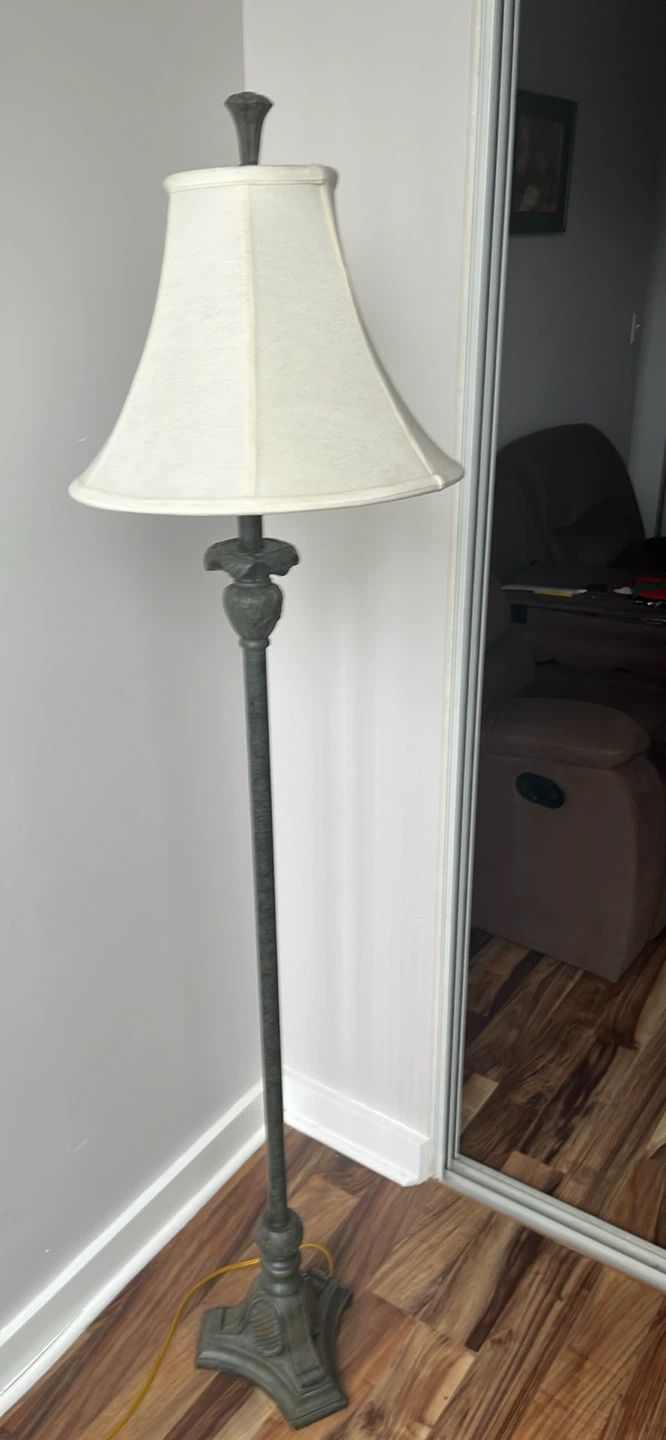 Selling a floor lamp with a beige lampshade. It's in good condition and would be a nice addition to any room. The base has a decorative design.