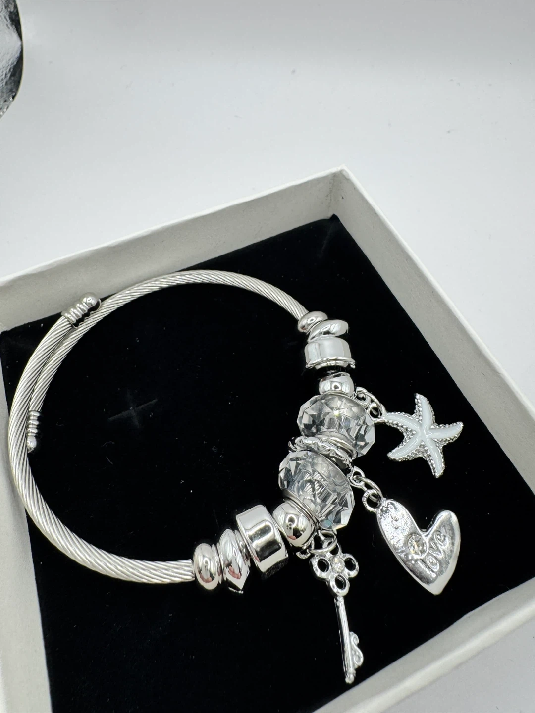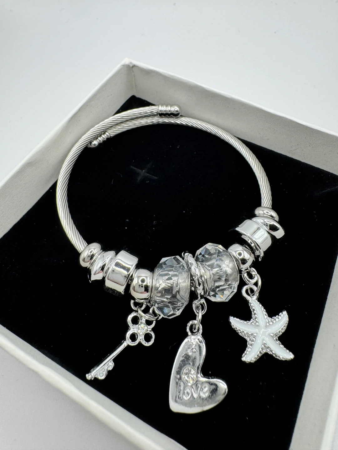 This silver-toned charm bracelet features a twisted cable band. It comes with several decorative charms, including a heart with 'love' inscribed, a vintage-style key, and a white starfish. The bracelet is presented in a white gift box with a black velvet lining.